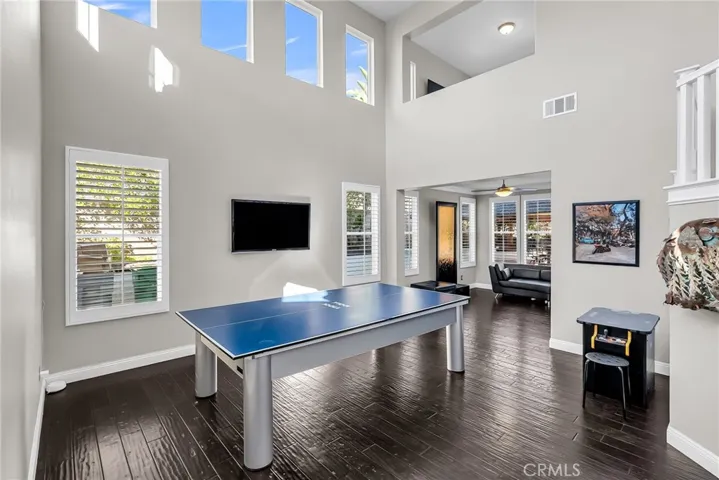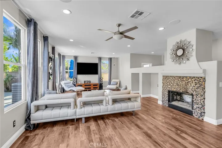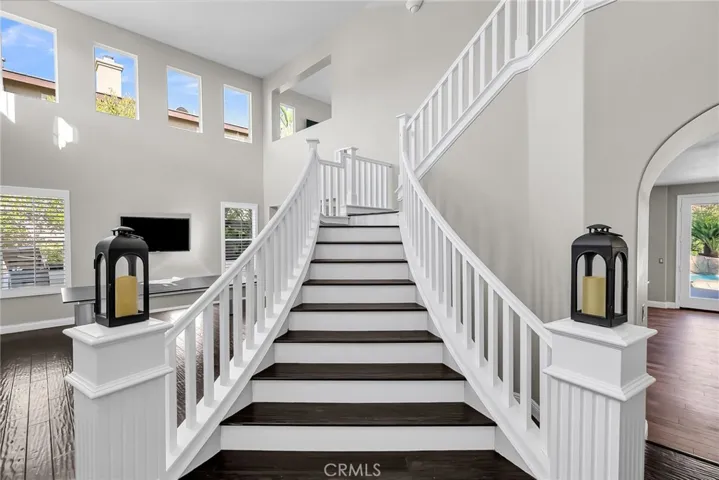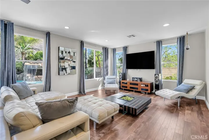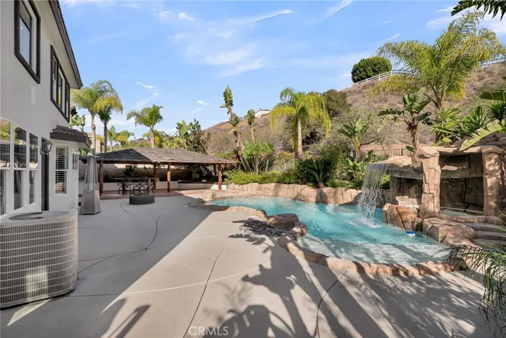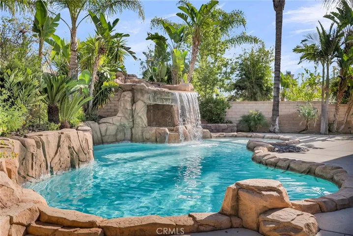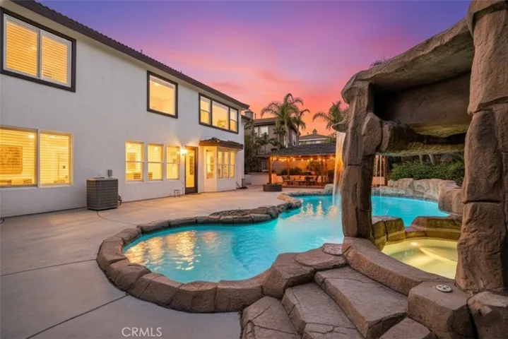 Beautifully upgraded home located in the highly desirable Eagle Glen community. This spacious residence features a large entry living room with vaulted ceilings and abundant natural light. The formal dining room is conveniently located off the kitchen, perfect for entertaining. The chef’s kitchen offers an oversized center island, ample counter space, and opens to the family room complete with a cozy fireplace. Downstairs includes a bedroom and full bathroom, oversized office, and laundry room for added convenience. Upstairs features three guest bedrooms, including one with an en-suite bathroom, plus an additional guest bath. The primary suite is light and bright, offering a luxurious en-suite bathroom with dual sinks, walk-in shower, center soaking tub, and walk-in closet. Enjoy resort-style living in the private backyard oasis, featuring a rock pool with waterfall, grotto-style spa, and palapa-covered patio—perfect for entertaining or relaxing. Additional highlights include a solar system, two-car garage, and a prime location near the 15 freeway, Fastrak entrance, schools, shopping, and dining.