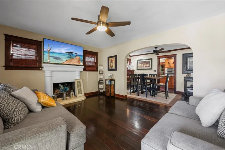 The interior boasts a charming Spanish style, a modified open-concept layout, and elegant wood-framed arches throughout. The kitchen has been beautifully updated with modern upgrades, granite countertops, newer cabinets, and appliances. Additional home features include upgraded copper plumbing, a new sewer line, tankless water heaters, and air conditioning.