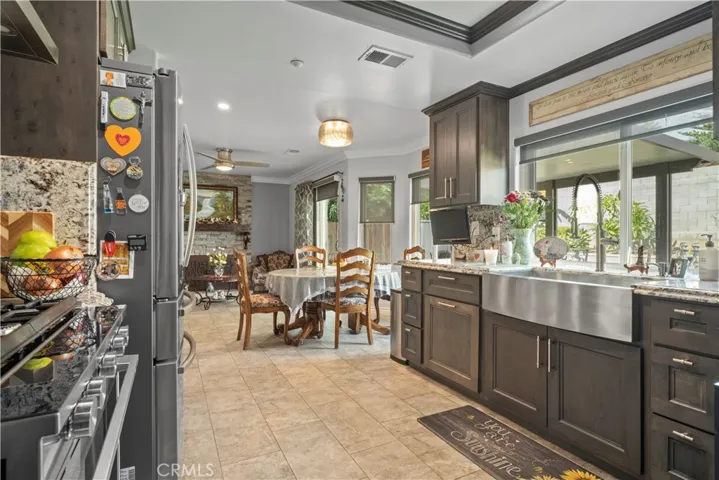 Inside, the home showcases smooth-finish drywall with rounded corners, crown molding throughout, and fresh eggshell paint in mint condition. The spacious living areas are bright and welcoming, enhanced by recessed lighting and a cozy fireplace. The gourmet kitchen is a true showpiece with custom cabinetry, a farm sink, double spice rack, granite countertops, and matching backsplash, all complemented by recessed lighting and upgraded fixtures.