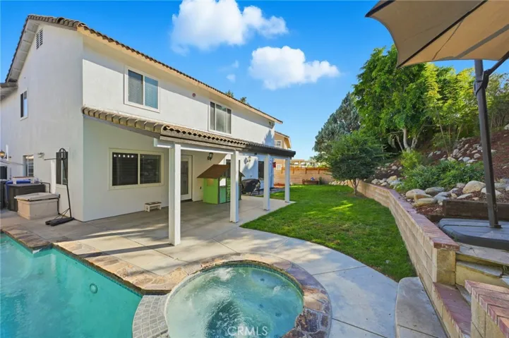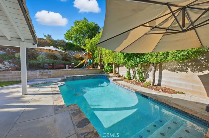 Step into your private backyard oasis featuring a custom swimming pool that’s ready for summer fun. The spacious outdoor patio includes a terrace area above the pool with potential for future expansion.