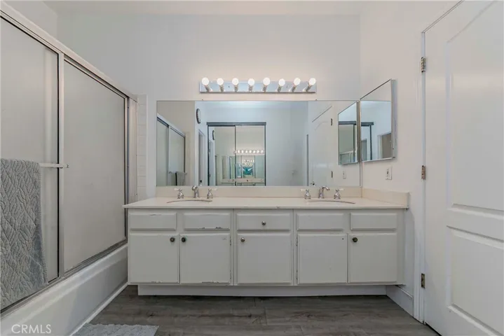 The spacious primary suite includes three closets and an ensuite bathroom with dual sinks and a shower-in-tub with glass enclosure. The second bedroom is perfect as a guest room or home office, while the hall bathroom offers a full tub for added comfort.
