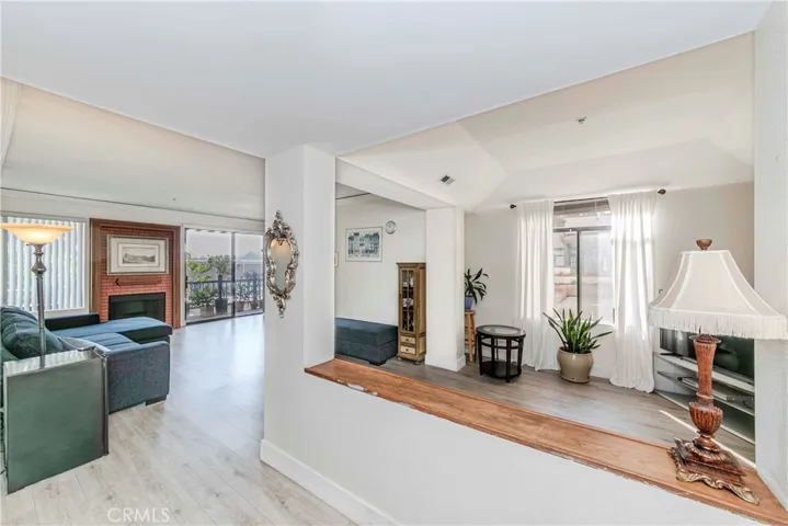 The remodeled kitchen showcases crisp white cabinetry, elegant countertops, and a stylish tile backsplash—perfect for both everyday living and entertaining. The living room features a warm fireplace and access to a wrap-around balcony, ideal for relaxing or enjoying your morning coffee. An extra sitting or den area off the living room provides the perfect spot for a home office, study area, or cozy reading corner.