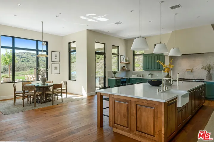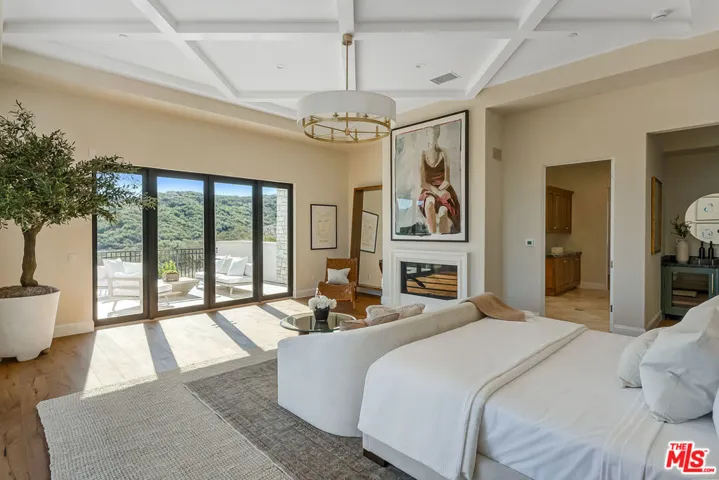 Set behind a private, gated driveway on 2.1 acres of pristine hillside, the residence captures sweeping, unobstructed canyon andsunset viewsthat overlook COSCA-protected open space, ensuring that its tranquil vistas will remain forever undeveloped. The architecture blends timeless European inspiration with the relaxed ease of California luxury. A stone-and-smooth-stucco facade introduces soaring ceilings, a grand entrance, with sunlight that spills acrosstravertine tile floors. The formal entry reveals a sweeping staircase and leads into elegant living spaces; a refined formal living room with fireplace and chandelier, formal dining room that opens to an interior courtyard with handcrafted fountain, and an open-concept family room framed by floor-to-ceiling glass and custom millwork. At the heart of the home lies a designerchef’s kitchenappointed with quartz countertops, custom cabinetry, and professional-grade Wolf, Sub-Zero, and Bosch appliances, complemented by a Thermador wine column. Every major room is accented by California Faucets fixtures, while elegant wood floors bring warmth, texture, and timeless sophistication throughout. Offering five spacious bedrooms and five-and-a-half baths, including a serene primary suite retreat with large private balcony, the home also features a versatile office studio ideal for work, wellness, or creative pursuits. Outside, the resort-style grounds mirror the home’s refined calm, a sparkling pool and spa, and dual-island outdoor kitchen overlook rolling hills, framed by manicured landscaping and multiple terraces for lounging or entertaining. The property’s setting strikes the perfect balance of privacy and convenience: it’s surrounded by nature yet moments from the upscale shopping, dining, and community life of Westlake Village and Calabasas. This newly constructed Westlake Village estate offers elegance and sophistication without the LA City mansion tax. Families will appreciate the home’s location within top-rated school districts just a 15-minute scenic trail walk to Westlake Elementary, and minutes from Oaks Christian School. Impeccably built, ideally located, and naturally secluded, this residence defines elevated living where architectural grace meets enduring privacy and the very best of Westlake Village luxury.
