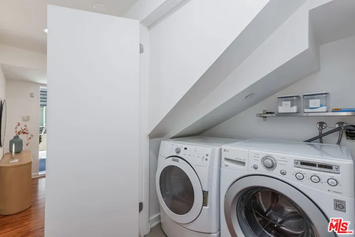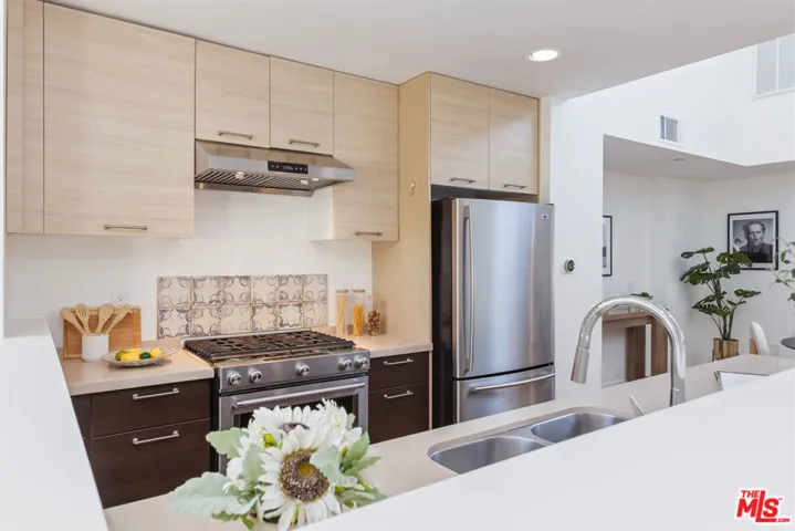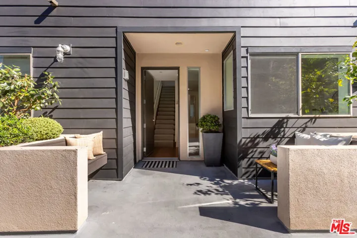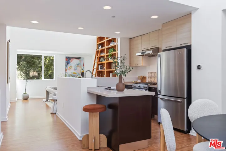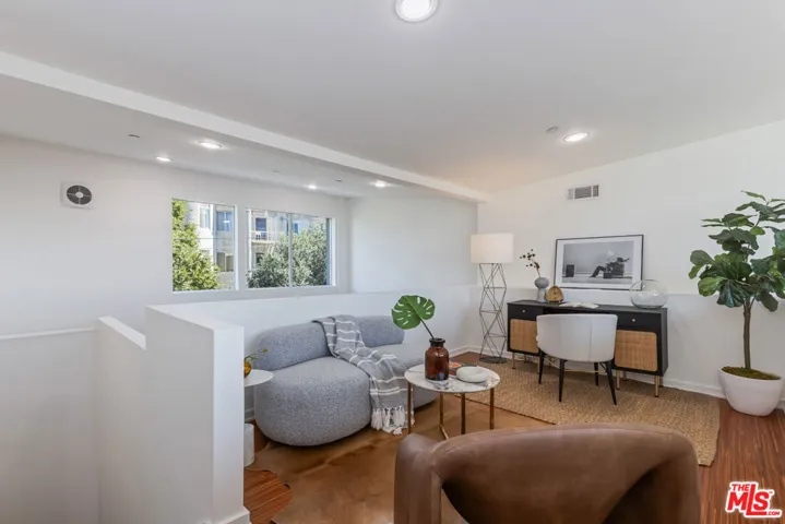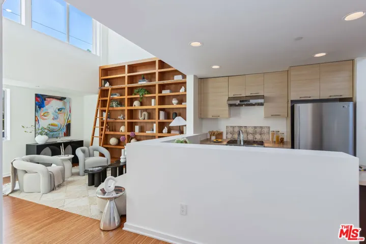 Stylish, design-forward Modern townhome in award-winning building by Chu + Gooding Architects. 2 beds/2.5 baths plus a lofted mezzanine with sweeping views. Clean lines, open volumes, and voluminous double-height ceilings create a striking interplay of space and light. The entry level provides a tranquil primary suite, a guest suite and convenient in-unit laundry. Upstairs, an airy living and dining area opens to a balcony enveloped in greenery, while a sleek kitchen, custom bookcase and powder room complete the level. Above it all, the lofted mezzanine floats in light, an inspiring space for work, art or relaxation with sunset views over the Hollywood Hills that stretch toward Century City and beyond. Located in one of Silver Lake’s most vibrant neighborhoods, a short stroll to local favorites Courage Bagels, Sqirl, Doto, Budonoki, Bellevue Park, and all of Sunset Junction. With gated side-by-side parking, guest spaces, and private storage, this home captures the essence of East side living – Modern, creative and effortlessly cool.