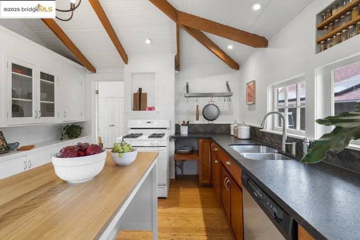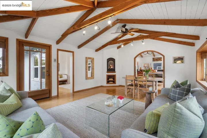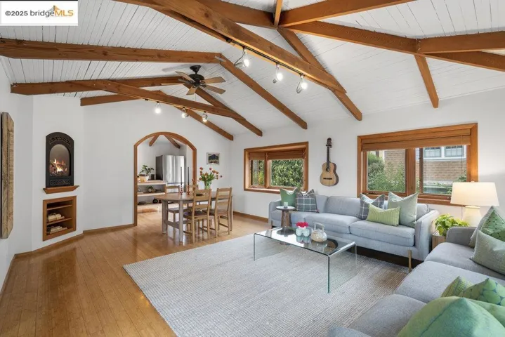 Utterly delightful top-floor condo has architectural gravitas thanks to vaulted, exposed beam ceilings and spacious airy rooms. This charmer feels and lives like a house in the core of Elmwood, a premium location minutes from the buzzy College Avenue amenities and UC campus. With its sweet front porch, dramatic living room, big dreamy kitchen, in-unit laundry and dedicated parking, it is packed with cheer, charm and utility. Green outlooks, cocoon-like privacy, gas fireplace, shared rear gardens and dedicated storage truly set this condo apart. Out and about, you’ll find a multitude of dining, shopping and recreation options within easy reach, from the University District and Downtown Berkeley to Elmwood and Rockridge.