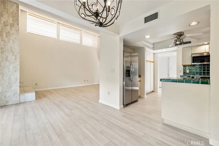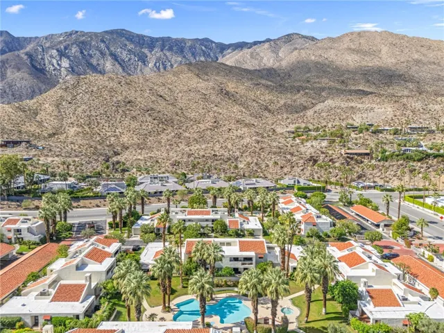 Discover this exceptional mid-century modern condo that offers the privacy and spacious feel of a single-family home. Situated in a gated community, this charming West-facing, end-unit, single-story home features brand new luxury vinyl floors, fresh paint throughout, and numerous upgrades including shutters, fridge, microwave, washer, dryer, and a brand-new water heater. In addition, there is no land lease providing long term value! The spacious living and dining areas feature stunning vaulted tongue-and-groove wood ceilings and a beautiful split marble fireplace, creating a light and airy ambiance complemented by breathtaking views of the San Jacinto Mountains. Step outside to the custom built front lanai; perfect for morning coffee surrounded by mature landscaped grounds. This home also offers custom shelving in the closets and garage, providing smart storage solutions. The back patio shares a yard with the neighboring unit and offers a private entrance to one of the pools. Resort-style amenities include two, tennis courts, pools and spas. Only one of several units to offer a convenient, attached one-car garage with direct access. Walk to downtown Palm Springs and enjoy the varied museums, unique shops, and incredible restaurants. Experience the perfect blend of classic mid-century design and elevated modern comfort in this beautifully maintained home. Don’t miss out on this chance to make it yours!