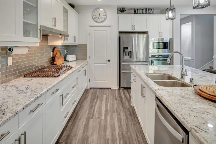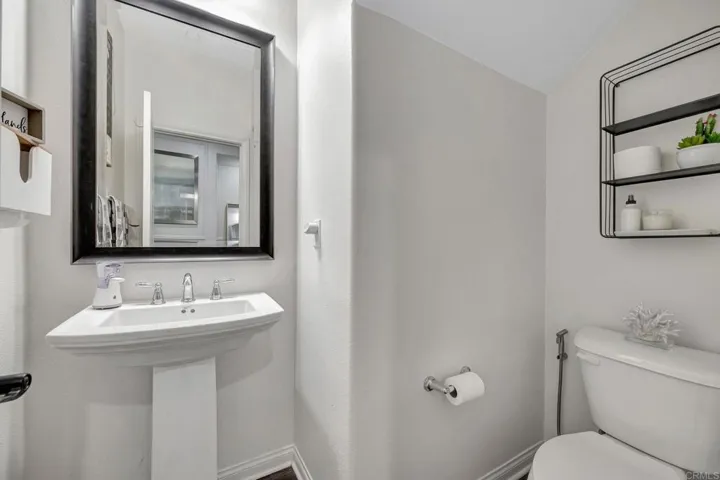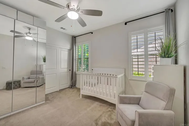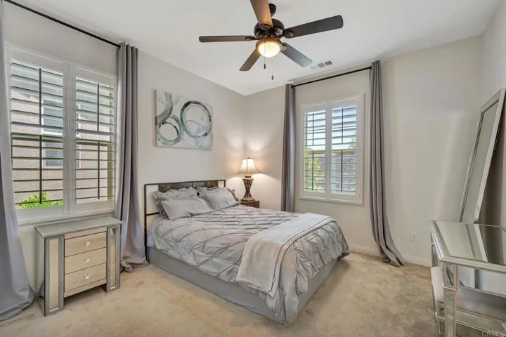 End lot Seabreeze neighborhood home in Harmony Grove Village has 4 bedrooms, 3.5 bathrooms and features multiple built-ins, picture frame wainscoting, accent walls, and upgraded flooring throughout. The flexible floor plan includes a first-level bedroom with an attached private bathroom, a dedicated office with a walk-in closet, an upstairs loft, and thoughtful storage nooks. Additional highlights include owned solar, plantation shutters, a chef’s kitchen with granite countertops & stainless appliances, built-in media center, tankless water heater, a low-maintenance backyard with pavers, and a spacious primary suite. The kitchen is a true standout, featuring updated flooring, white cabinetry with two upper cabinets showcasing glass-front doors, granite countertops, and a large center island with seating. Additional upgrades include a full custom tile backsplash, under cabinet lights, stainless steel appliances, pendant lighting, and pull-out trash receptacles. The kitchen opens to a bright dining area accented with wainscoting and windows that bring in abundant natural light. Sliding glass doors lead directly to the backyard, creating a seamless indoor-outdoor connection. Throughout the main level, you’ll find elegant picture frame wainscoting, updated flooring, and custom millwork. A stylish hallway nook with a built-in ledge and arched mirror provides visual interest and display space. The powder room is conveniently located and finished with modern upgrades. The family room includes a built-in entertainment system with shelving and lower cabinet storage, a ceiling fan, and plenty of space for comfortable seating. The adjacent paved backyard is low maintenance and ideal for outdoor entertaining or relaxing, with multiple areas for seating and easy access from the main living area. The versatile first-level office offers a picture frame wainscoting accent wall, plantation shutters, updated flooring, and a walk-in closet. The first-level bedroom features a custom wood-paneled wall, plantation shutters, a closet with wood sliding doors, and an attached private bathroom with custom tile backsplash, updated fixtures, and a floor-to-ceiling tile shower with frosted glass doors. Upstairs, the spacious loft offers flexibility for a second living area, office, or media room and includes recessed lighting, a ceiling fan, and a charming round window in a custom-cut nook. Additional upstairs bedrooms include ceiling fans, plantation shutters, and closets with sliding wood doors. A built-in storage nook with storage cabinets adds function to the upper hallway. The upstairs bathroom features white countertops, a custom tile backsplash, an extra-large mirror, and a shower/tub combo. The upstairs laundry room is fully equipped with upper and lower cabinetry and multiple hanging racks for added convenience. The primary suite features a ceiling fan, plantation shutters, a built-in shelving nook with lower storage, and accent wall. The en-suite bathroom includes dual sinks, tile backsplash, a wall-to-wall mirror, a soaking tub, a walk-in tile shower with bench seating and glass doors, a private toilet room, and a spacious walk-in closet with recessed lighting. Harmony Grove Village is a master planned community with gorgeous mountain ridgeline views, multipurpose trails, gated pool for homeowners, multiple private parks and huge 4th of July Park (open to the public). The Grove is the perfect place to enjoy the outdoors- it includes the pool, jacuzzi, wading pool, barbeques, shaded tables, play structure and a covered lounge area with outdoor furniture and fireplace.