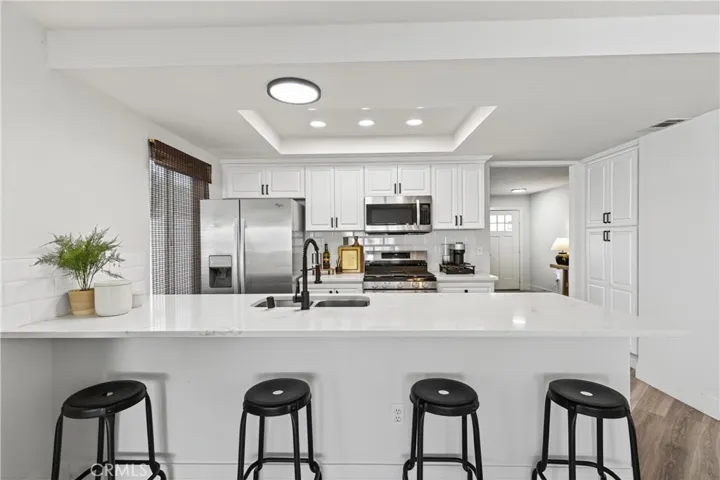 Flowing from the living area is the updated kitchen, complete with stainless steel appliances, quartz countertops, soft-close cabinetry, and a large peninsula island that doubles as a breakfast bar. The open-concept layout connects perfectly to the generous dining area — a great spot for hosting family gatherings or placing your Christmas tree!