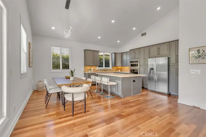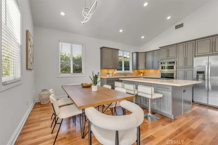 The modern eat-in kitchen showcases sleek quartz countertops, a central island with cooktop, stainless steel appliances, and a welcoming dining area overlooking the private patio and heated pool — perfect for indoor-outdoor California living.