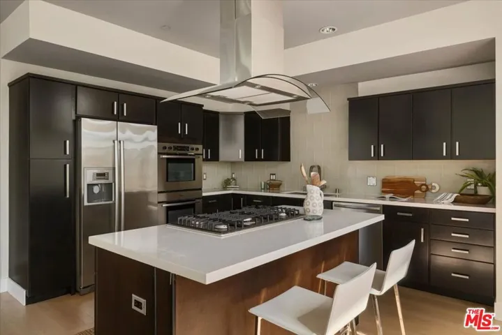 Discover this stunning 2-bedroom, 2.5-bath modern loft-style home, offering sweeping views and sophisticated design in the heart of Los Feliz. The entry level features an en suite bedroom ideal as a guest suite or home office with direct access to a private patio bathed in natural light. Relax in the sparkling hot tub or unwind in the peaceful outdoor space. Up one level, the open-plan kitchen and living area are framed by double-height ceilings and walls of glass, filling the space with light and capturing panoramic south and east-facing views. The balcony invites outdoor dining and entertaining, while the kitchen boasts quartz countertops, Bosch appliances, and convenient access to laundry, storage, and a half bath. The spacious primary suite spans the entire top level, showcasing breathtaking views, built-in storage, a walk-in closet, and a spa-inspired bath with double vanity, soaking tub, and a separate stone-wrapped shower. A private two-car garage with EV charging and direct home access completes the property. Recent updates include owned solar panels, new flooring, refreshed stucco and teak exterior finishes, resurfaced balconies, and a new elastomeric roof coating. Work is also underway on a new landscaping project scheduled for completion this fall. Enjoy modern living just moments from Griffith Park and the best dining, shopping, and entertainment in Los Feliz, Silver Lake, and Atwater Village.