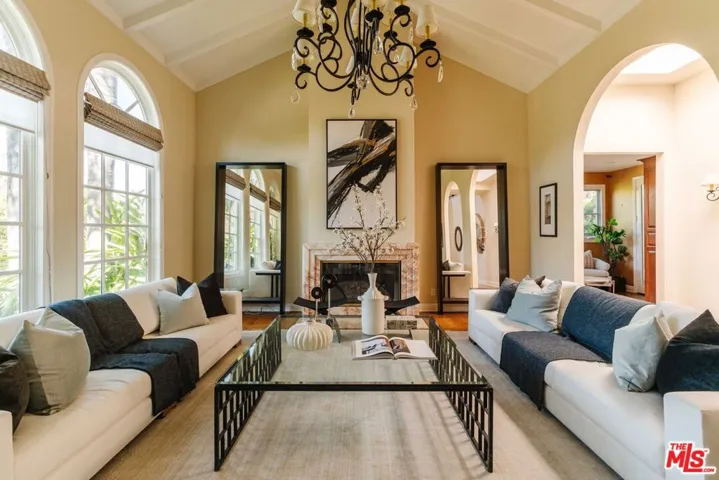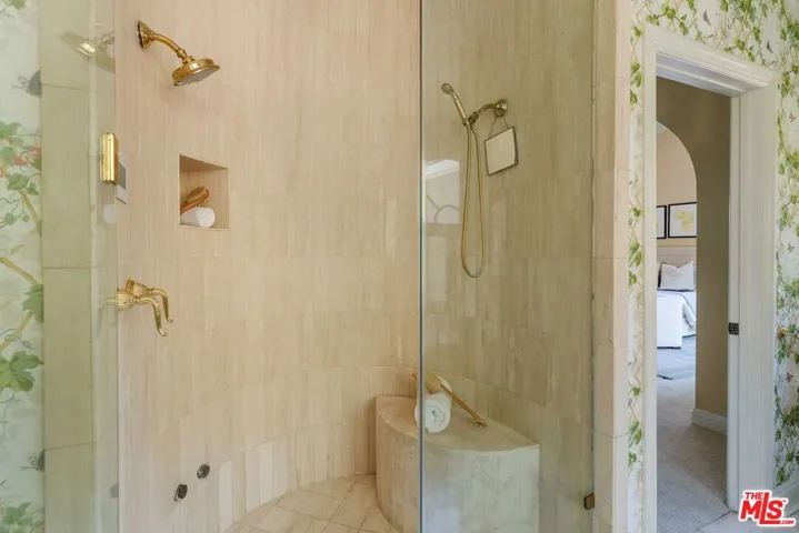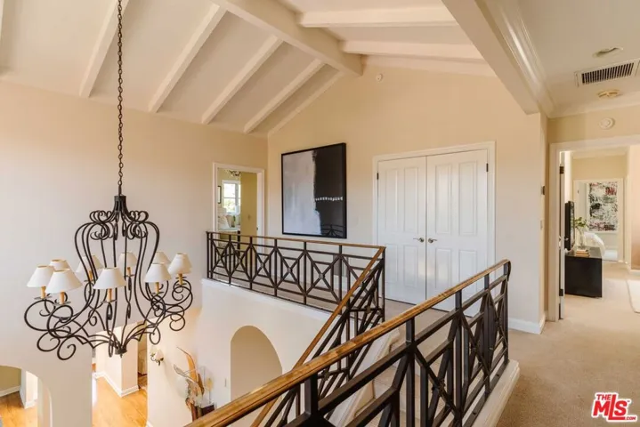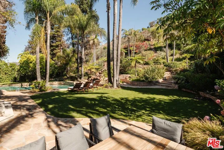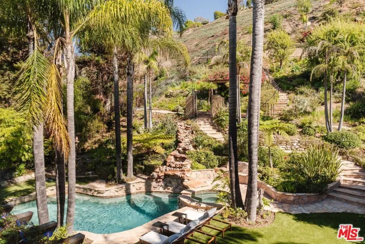 Nestled on a coveted street in the Palisades Highlands, this private residence blends timeless design, thoughtful expansion, and one of the neighborhood’s most exceptional backyards – all on over three quarters of an acre. Guests are welcomed beneath a grand two-story foyer, flanked by a stately formal living room with a fireplace set beneath vaulted, beamed ceilings. Beyond the spacious family room, the chef’s kitchen features dual islands, top-of-the-line appliances and an informal dining area overlooking the serene landscape – opening seamlessly to the backyard. Down the hall, find a large formal dining room, study/office, and a media room with an ensuite bath that can serve equally well as a theater or secondary downstairs guest room. Completing this level are the laundry room, guest room, and direct garage access. Upstairs, discover three bedroom suites, including a stunning primary wing. This expansive retreat offers a large bedroom under vaulted ceilings with backyard views from a private balcony, two walk-in closets, and a luxurious bath with dual vanities, a soaking tub, and an oversized steam shower. One of the guest suites includes its own den/play area that could easily double as a fourth upstairs bedroom or secondary office. The resort-like backyard is a true highlight, showcasing a custom pool and spa, waterfall, putting green, heated loggia with fireplace for dining or lounging, manicured landscaping, BBQ area, and a private walking trail leading to multiple view decks. Residents enjoy access to incredible hiking trails as well as the Highlands recreation center with tennis courts and a forthcoming clubhouse with pool. With its welcoming atmosphere and strong sense of community, the Highlands continues to thrive – especially on this street, where most homes remained untouched by the fire.