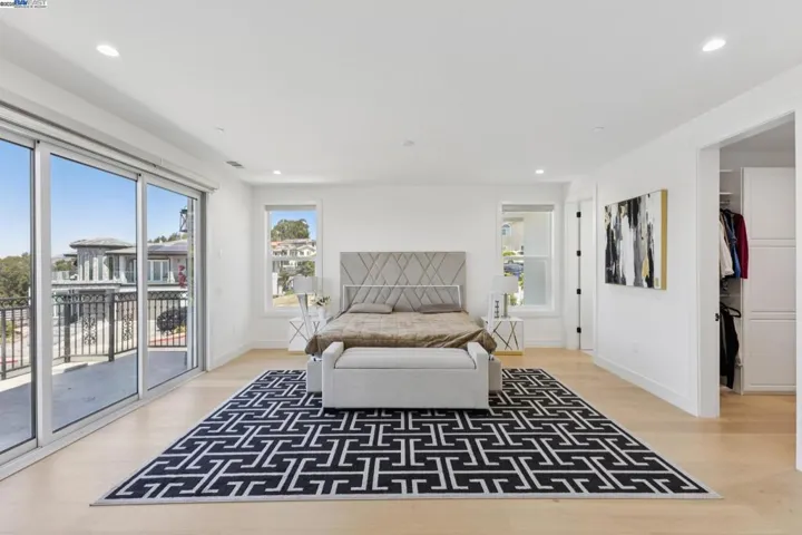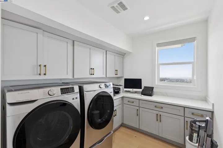 Stunning custom-built home in an exclusive gated community in the Fairview District with breathtaking Bay and SF skyline views. This 4-bedroom, 4-bathroom residence offers luxurious living with all ensuite bedrooms featuring walk-in closets. Step through the grand double doors into a soaring entry with a circular glass staircase and a custom chandelier. The open-concept layout features rich hardwood floors throughout, two full kitchens, including a prep kitchen, and two laundry rooms one on each level for added convenience. The main kitchen features premium appliances, quartz countertops, and modern finishes. Multiple view decks and large windows showcase panoramic vistas. The primary suite offers a spa-like bath with a soaking tub, walk-in shower, dual vanity, and custom tilework. Additional highlights include a paid-off solar system, EV charger, whole-house ventilation system, and beautifully landscaped outdoor spaces. A rare opportunity to own a showstopping home with privacy, functionality, and views in the Bay Area.