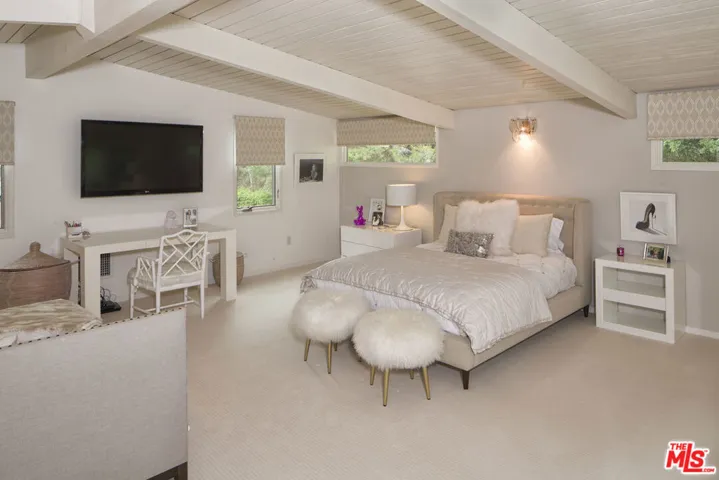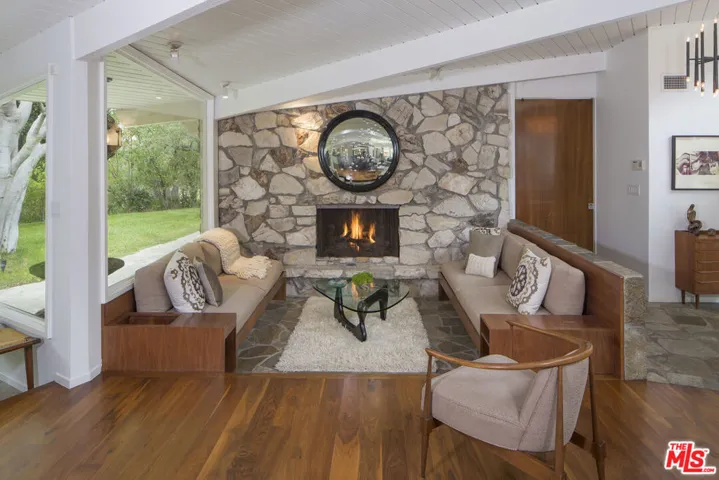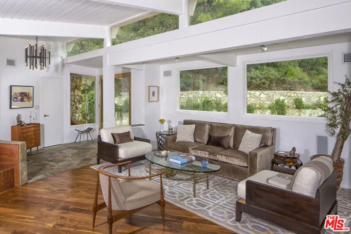 Sequestered up a long gated drive, this exquisitely renovated Mid-Century estate delivers true privacy and effortless indoor/outdoor living. Walls of glass frame oak-studded grounds across an expansive ~0.83-acre lot, creating serene sight lines from nearly every room. Inside, generous open spaces include a chic step-down living area with fireplace and a versatile family/den/home-theater ideal for everyday lounging or screening nights. The pristine center-island kitchen anchors the home and flows easily to outdoor dining and entertaining. The flexible layout offers two luxurious bedroom suites plus two additional bedrooms, for a total of 4 bedrooms and 5.5 baths. Outside offers resort-style grounds with heated pool and spa, outdoor shower, fire pit, and expansive al-fresco patios – your own private compound moments from Beverly Hills.