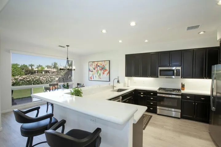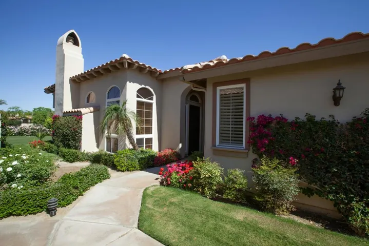Experience the essence of desert luxury in this beautifully remodeled Casita, perfectly positioned along a wide greenbelt with panoramic views of the majestic Santa Rosa Mountains. Framed by lush palm and citrus trees, this serene retreat captures the beauty of the desert at every turn–whether you’re enjoying your morning coffee or evening cocktails, the views and ambiance are simply unforgettable. This is one of the few Casitas that boasts its own private spa two steps away from the primary bedroom suite. The open great room floor plan is light and inviting, featuring tall ceilings, expansive windows, and a seamless indoor-outdoor flow that takes full advantage of the mountain vistas. The interior has been thoughtfully remodeled from top to bottom, with attention to detail in every space. Elegant wood-look ceramic tile flooring flows throughout, complemented by fresh interior paint, new shutters and blinds, and hand-painted millwork and furniture that enhance the home’s warm, modern style. The living area centers around a redesigned fireplace with new surround and mantle, adding a sophisticated focal point for cozy evenings. The remodeled kitchen shines with quartz countertops, refinished cabinetry, stainless steel appliances, new sink and disposal, and a chic chandelier above the dining area. A designer ceiling fan adds flair and comfort to the great room. The spacious primary suite offers tranquil privacy with a private spa just outside the bedroom, plus a large bathroom with dual sinks, soaking tub, oversized shower, and a walk-in closet with built-in organizers. Two inviting guest bedrooms share a remodeled adjoining bath, and there’s an updated powder room with a new sink. Additional upgrades include: two new air conditioners (home and garage), garage epoxy flooring, new TVs, new area rugs and furnishings (per Inventory List), and a Water Cop leak protection system that connects to your phone for peace of mind. An electronically operated patio awning provides instant shade when you want it, making outdoor living effortless. This exceptional Casita combines elegance, comfort, and smart technology–offering a perfect blend of modern convenience and timeless desert charm.