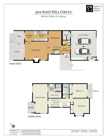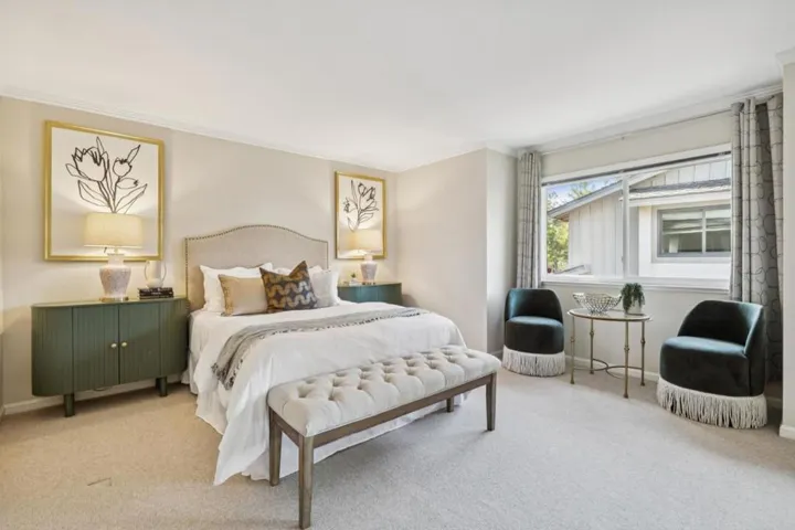 End-unit townhome overlooking the 14th fairway of Sharon Heights Golf and Country Club. Beautifully remodeled across multiple levels, the home features richly hued hardwood floors, fine carpeting, detailed millwork, and expansive windows framing golf course views. The main living areas include a spacious living room with coffered ceiling, gas-log fireplace, and sliding glass doors opening to a tiled deck ideal for outdoor dining and lounging overlooking the fairway views. The formal dining room is finished with crown moldings, while the remodeled kitchen showcases white cabinetry, exotic granite slab counters, stainless steel appliances, and a breakfast area that also opens to the fairway-view deck. The mezzanine-level primary suite has a vaulted ceiling, customized walk-in closet, and sitting area with balcony overlooking the fairway. Two additional bedrooms comprise the upper level, one designed for office use and opening to a private front balcony. Additional features include an attached two-car garage with separate laundry room, community pools, spas, and private event space, plus access to excellent Las Lomitas schools.
