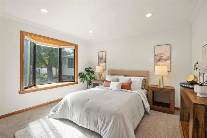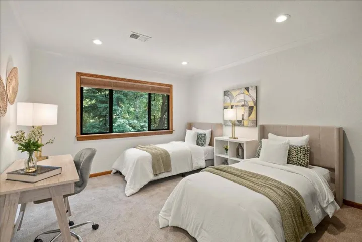 Gated and private, this elegant Spanish inspired home features tile roof, arch windows, stucco arches. Serene, and private courtyard, with water fountain, extensive stone pavers, and a grand oak tree leads to a beveled glass double door entry to a spacious, bright and charming home. Spacious family room with vaulted ceiling, fireplace, and wet bar with French doors leading to a sunroom with stunning views. Large step down living room with arched windows. Spacious primary suite with attached sunroom/cozy sitting area to capture the stunning views, dual vanities, two walk in closets, and a sunken tub. Enjoy outdoors living, surrounded by mature trees, with stunning views. The expansive multi level decks provide the ultimate setting for entertaining. Gleaming new refinished hardwood floors in most of the home. New plush carpet. Dual HVAC systems (2019). Water heater (2020). Remodeled laundry room with new cabinetry and stone top. New recess lighting throughout. Spacious 3 car garage, with new epoxy floor, and carriage house design doors. Ample outdoor storage sheds. Fresh interior and exterior paint. Saratoga schools