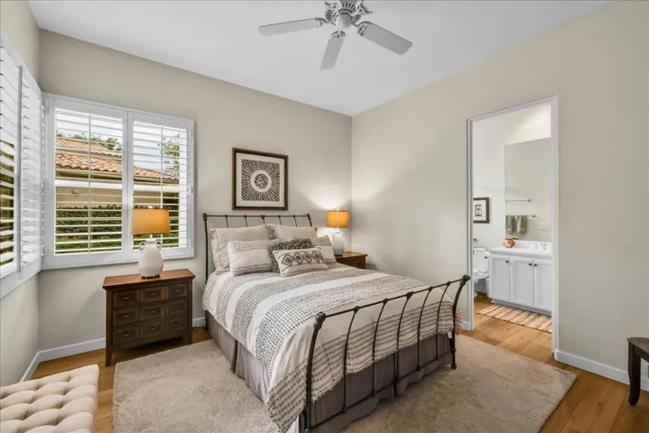 Experience the ultimate lock-and-leave lifestyle in this impeccably maintained and updated 2-bedroom, 2.5-bath Casita at Rancho La Quinta Country Club, ideally positioned moments from world-class amenities. The refined interior features high ceilings, premium Luxury Vinyl Plank flooring, and a gourmet kitchen boasting two-toned Shaker cabinetry and sleek Quartz countertops. The great room offers a captivating, Southern-facing vista that sweeps over the lush greenbelt, the manicured croquet lawn, and perfectly frames the Santa Rosa Mountains. The Primary Suite is a private haven with an updated en-suite bath and custom built-in closet, complemented by a spacious guest suite with its own bath. The highly anticipated remodeled Clubhouse, scheduled to debut mid-season 2026. Convenience is paramount with a dedicated laundry area and Social/Sports Membership included in HOA Dues. Furnishings may be available separately, ensuring a seamless transition to your effortlessly distinguished Rancho La Quinta lifestyle.