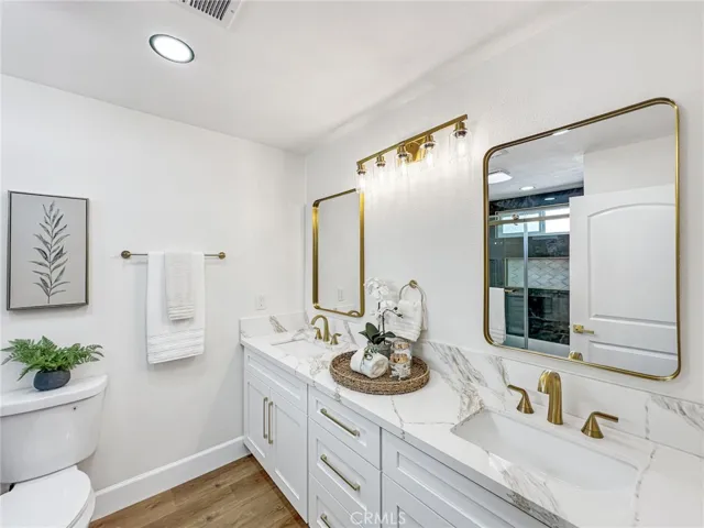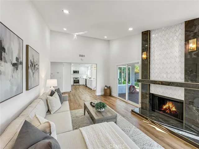 Welcome to 23516 Villena – a beautifully remodeled single-story home in the highly sought-after 55+ gated community of Casta Del Sol. Perfectly positioned near the top of the community, this stunning 2-bedroom, 2-bath residence offers 1,279 square feet of refined living space, blending timeless elegance with modern upgrades. Step inside to discover a light-filled, open-concept floor plan designed for both comfort and style. The heart of the home is the show-stopping kitchen—completely renovated with brand-new soft-close cabinetry, brushed gold hardware, gorgeous quartz countertops, and premium stainless steel appliances. The spacious living area centers around a custom-tiled fireplace, complemented by double-pane windows and sliding doors that fill the home with natural light while preserving a sense of serenity. The primary suite is a private retreat featuring generous closet space and a luxurious en-suite bathroom with a dual-sink vanity with quartz counter and a designer-tiled shower. Additional enhancements include new luxury vinyl plank flooring throughout, LED recessed lighting, upgraded electrical fixtures, and elegant finishes that reflect superior craftsmanship. Step outside to the beautifully designed stamped-concrete patio—an ideal space for relaxing or entertaining in privacy and peace. Casta Del Sol offers a true resort-style lifestyle with two recreation centers featuring swimming pools, spas, pickleball and tennis courts, a fitness center, clubhouse, billiards room, and more—all set within 484 acres of rolling hills and mature landscaping. HOA amenities include front yard maintenance, exterior painting, and trash service for effortless living. As a resident, you’ll also enjoy exclusive access to Lake Mission Viejo, with boating, fishing, picnic areas, and scenic walking trails. Don’t miss this exceptional opportunity to own a move-in-ready gem in one of Mission Viejo’s most desirable active adult communities.