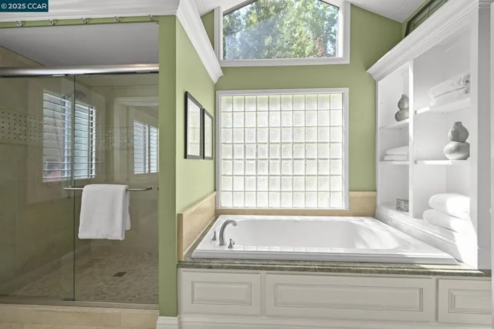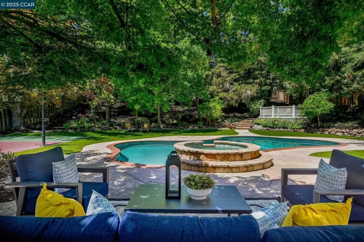 Fantastic home and a FANTASTIC NEW PRICE! Tucked behind the gates of the coveted Hidden Oaks community, this timeless estate blends classic design with resort-style living. Soaring vaulted ceilings and an abundance of natural light create a warm and inviting ambiance throughout. The thoughtfully designed floor plan features a main-level primary suite with French doors opening to the backyard, a luxurious spa-inspired bath with soaking tub and shower, walk-in closet with custom built-ins, and a private laundry area. A secondary downstairs bedroom—currently used as an executive office—includes a built-in Murphy bed and easy access to the guest bath, offering exceptional flexibility for guests or remote work. Upstairs, three additional bedrooms include one with an en-suite bath, plus a full hall bath and dedicated laundry room. Step outside to your private oasis with a resort-style pool and spa, sport court, and lush grounds designed for effortless indoor-outdoor living. The expansive backyard also offers space for a potential pool house or ADU, adding even more value and versatility.