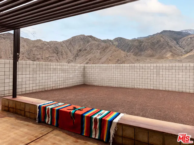 Located in the serene Windy Cove neighborhood of unincorporated Palm Springs, this home blends retro charm with thoughtful modern upgrades that celebrate its mid-century inspired architecture. Step through custom architectural metal gates and vintage double doors into an inviting open floor plan filled with natural light and uninterrupted views of the majestic San Jacinto mountain ridge. The living and dining rooms feature new high-quality hardwood panel flooring and a dramatic natural stone fireplace, the perfect centerpiece for cozy desert evenings. The efficient galley-style kitchen offers a large bar for casual dining, freshly repainted cabinetry, and updated fixtures that add a modern touch. The primary suite, showcasing beautiful mountain views, includes an en-suite bath with a vintage countertop and ample closet space. Two additional bedrooms offer generous closets, and the hall bath also featuring a vintage countertop provides easy access from the main living area. Every window throughout the home has been replaced with energy-efficient dual-pane glass and custom made sun/security shades for year-round comfort. Outdoor living is effortless with a fully enclosed front and back yard, covered patio, low-maintenance desert landscaping, and irrigation. The front breeze block patio provides privacy and style, complete with a gas fire pit ideal for stargazing on cool desert nights. Out back, under the shaded patio enjoy sunrises and sunsets that paint the sky, with wildlife often visible in the open field beyond. The two-car garage is a dream for organization lovers, featuring custom shelving, overhead storage, and an insulated door. Additional upgrades include recent roof resealing, all new light fixtures throughout, fresh interior paint, twice-yearly HVAC maintenance, vintage wallpaper accent in the laundry room with storage, gas indoor fireplace and outdoor gas grill for easy entertaining. Just 6 minutes from downtown Palm Springs, you’ll enjoy the best of both worlds, peaceful desert living with quick access to shopping, dining, nightlife, and endless outdoor recreation. Listen to coyotes under the stars, spot riders on nearby horse trails, and experience the authentic desert lifestyle from the comfort of this thoughtfully updated mid-century inspired gem.