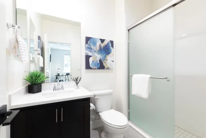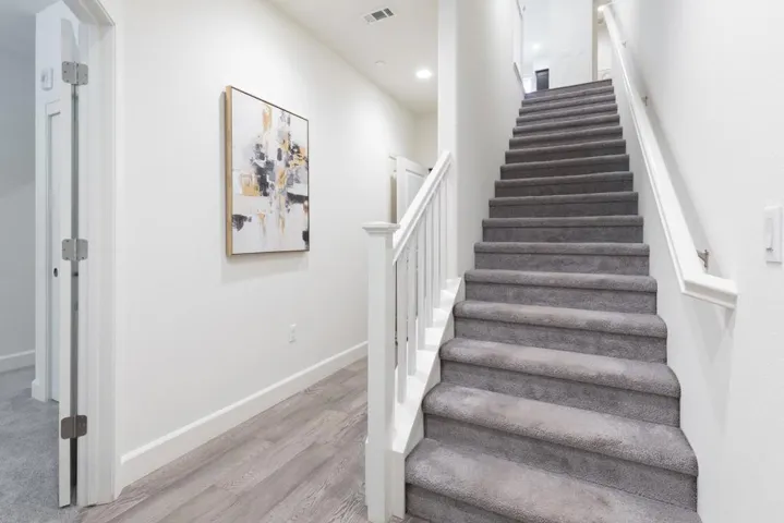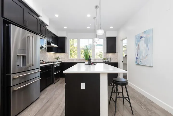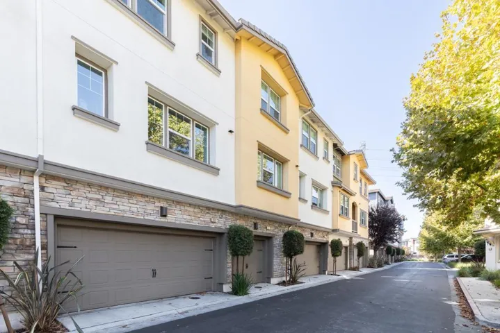 ENJOY DOWNTOWN PROXIMITY IN A WALK-UP SETTING | Built in 2017, this light-filled Sandalwood townhome showcases a prime walk-up location with the privacy of mature foliage only a mile away from downtown shopping and dining! Exquisitely maintained interiors reveal high ceilings, designer lighting, luxury floors, smart climate control, tankless hot water, and zoned AC. Open-concept gathering spaces wired for wall media unfold from a master chefs kitchen fitted with a grand island, elegant quartz countertops, Shaker cabinetry, walk-in pantry, and refrigerator and double-oven range by Cafe, All bedrooms are ensuite, including ground-level guest quarters/office and a primary retreat with dual vanities, a walk-in shower, and dual custom closets. Also enjoy fiber and Cat5E in every room, convenient upper laundry with smart LG appliances, and oversized two-car garage with finished walls and epoxy floors. Community amenities include luxuriant landscaping, private walking paths, a playground, clubhouse, and dog park. Steps from Apple and Google shuttles, and near Downtown Sunnyvale attractions like nightlife, Caltrain, the Farmers’ Market, and more!