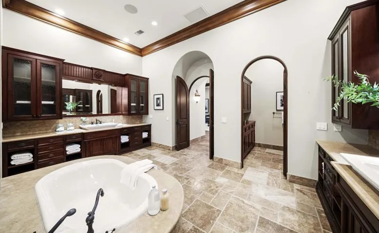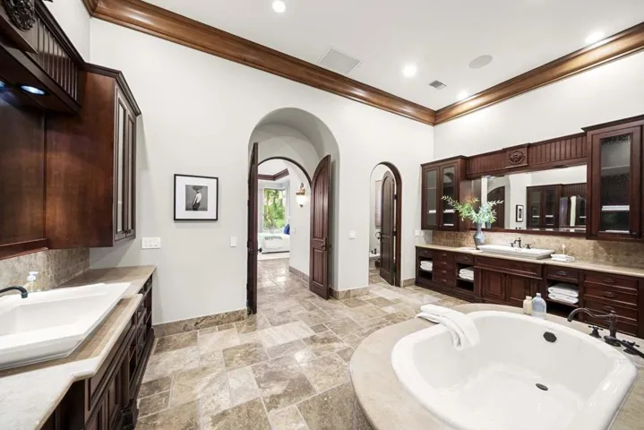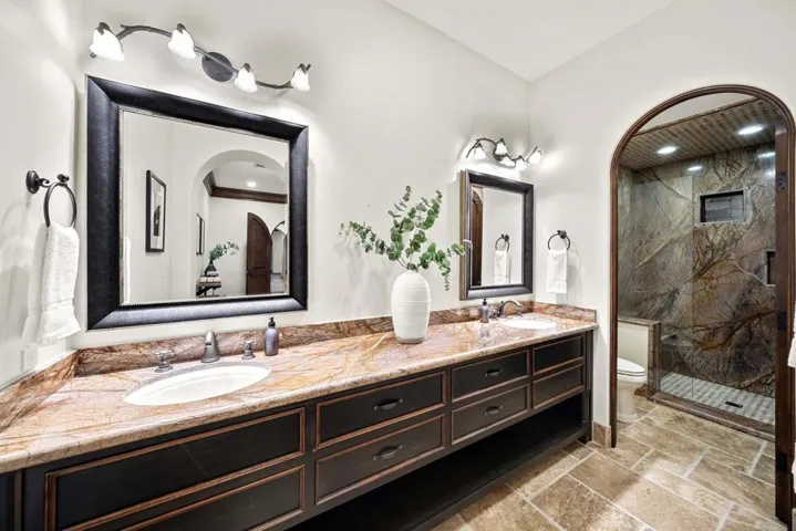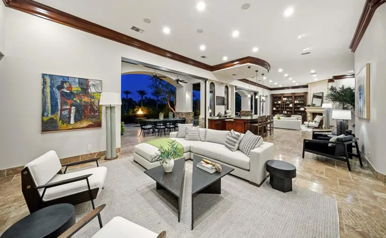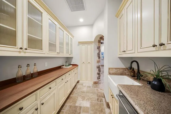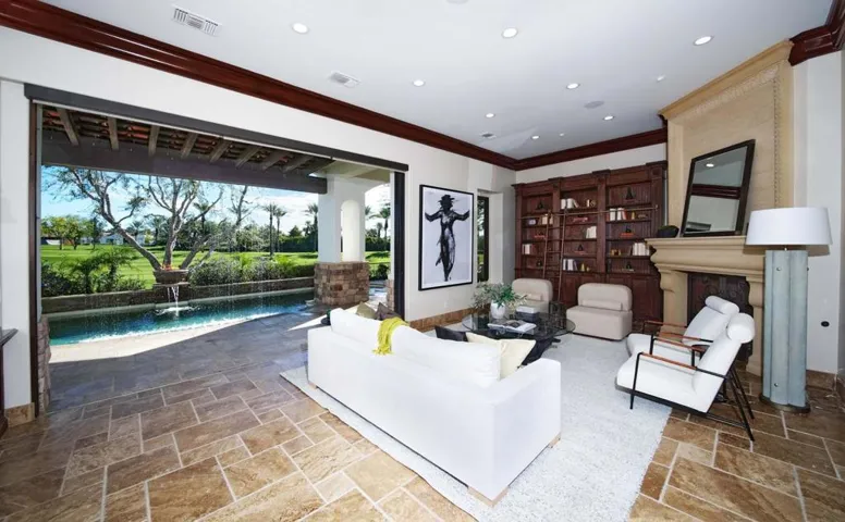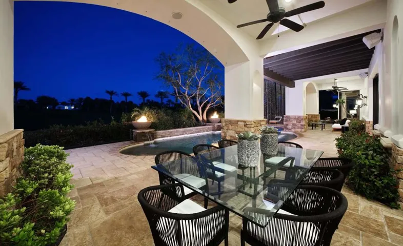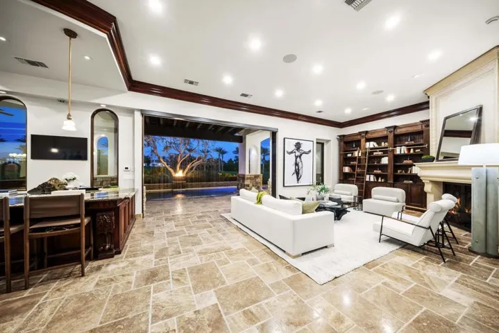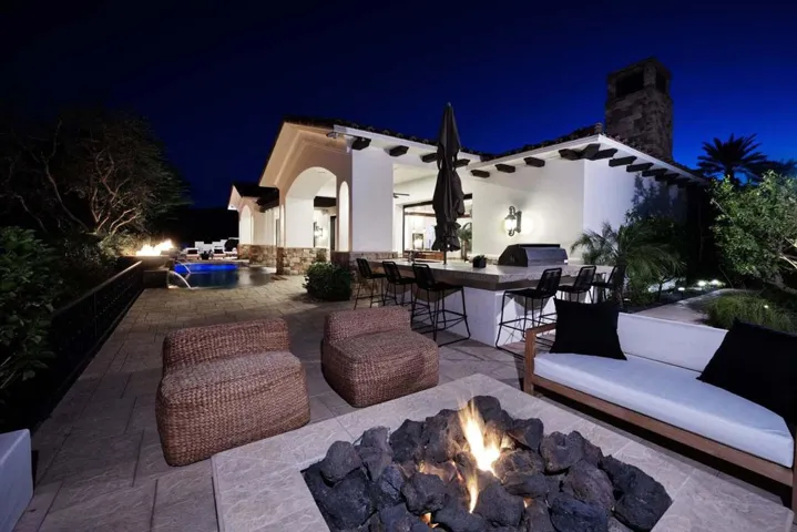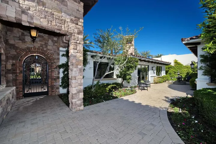 Situated on the 18th hole of Toscana’s coveted South Course, this custom estate offers breathtaking panoramic views of the fairway and surrounding mountains. Designed for seamless indoor-outdoor living, the home features travertine floors, elegant crown molding, and two sets of pocketing glass sliders that open to a stunning backyard retreat. The outdoor space is a true showstopper, complete with a custom pool showcasing water and fire features, a built-in barbecue, new landscaping, and decorative wrought iron fencing–perfect for both relaxing and entertaining. A detached two-bedroom guest house with a sitting area and kitchenette provides luxurious accommodations for visitors. The versatile floor plan includes a bonus room that can serve as a fifth bedroom, a game room, or a media room, offering flexible living space to suit your needs. Recent enhancements include four new high-efficiency HVAC systems with NEST thermostats–three serving the main residence and one for the guest house–plus ductless mini-split systems in both garages. A new refrigeration system with advanced controls supports the temperature-controlled wine cellar. The home is fully outfitted with recessed LED smart lighting, Lutron switches and outlets, and a 14-zone audio system with 16 speaker pairs, all managed through four wall-mounted iPads offering integrated SMART control of lighting, pool features, cameras, thermostats, and audio. Additional features include full interior and exterior paint, dual COVE dishwashers, LG washer and dryer, and owned solar for maximum energy efficiency.