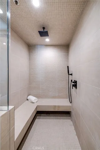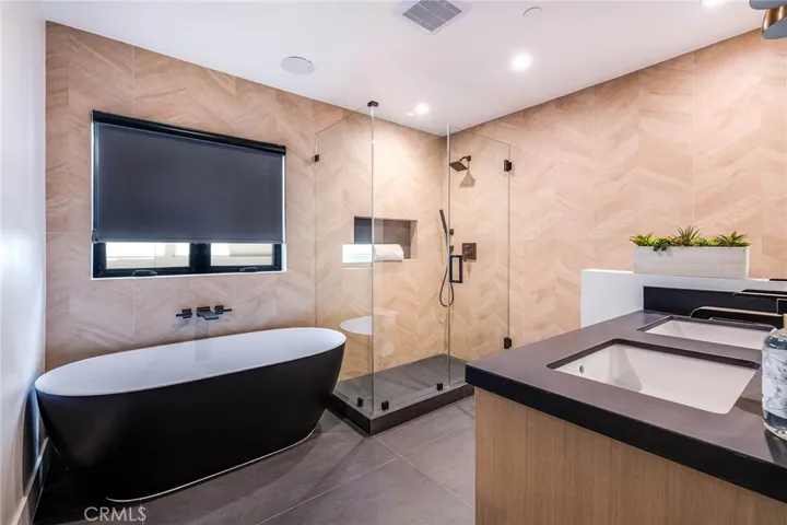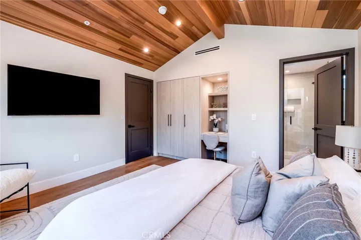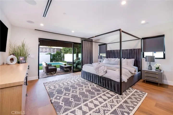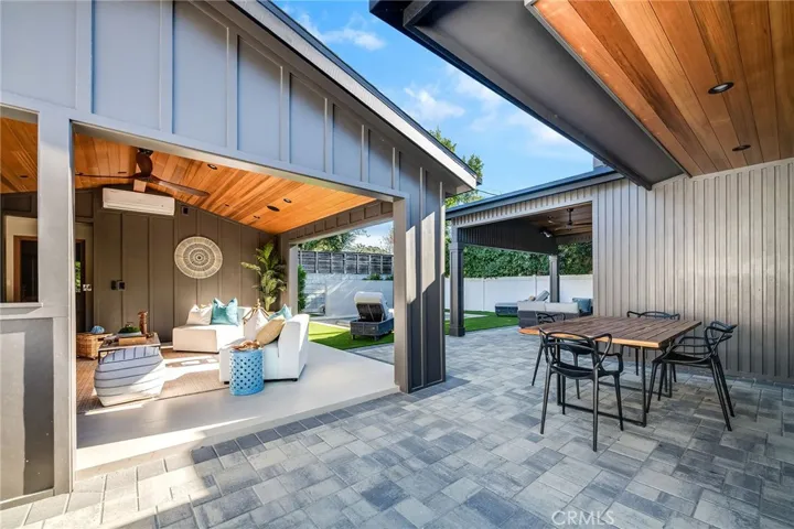 Expansive glass sliders from both the living area and primary suite open to a private outdoor oasis — a covered patio with fans and speakers, perfect for lounging or entertaining. The backyard is a true sanctuary, complete with a sparkling pool, open cabana, sauna, and steam shower for a luxurious at-home spa experience. An outdoor kitchen and generous secured parking complete this entertainer’s paradise.