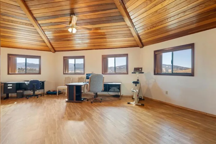 This unique, custom-built octagon home currently offers 2 bedrooms, with exciting potential to expand to 4. Soothing, panoramic views stretch from a nearly 1,800 sq ft wraparound deck, perfect for sunrise coffees. The residence features a newer metal roof and dual-pane windows for efficiency and comfort. A detached cabana with a spa provides a private retreat, while a spacious 4-car garage, half of which is set up as a workshop, adds versatility. Equestrian excellence awaits with a 1,728 sq ft barn and ample hay storage, two stalls, and a birthing stall. A separate pole barn hosts six stalls and a substantial 40×60 Quonset hut with a concrete floor offers expansive usable space. The 9,360 sq ft covered arena and a round pen complete the equestrian facility, all powered and backed by an automatic propane backup generator.. Water is secured by a private well supplying the barns and the property. A private pond adds charm and serenity, having only dried up twice in the last 30 years. With imagination, the Quonset hut could easily be converted into a living space for a destination vacation rental, ideal for horse enthusiasts seeking a country lifestyle. This property is ideally suited for horses, livestock, and anyone dreaming of a country living escape with abundant potential.”