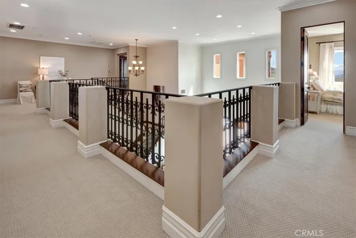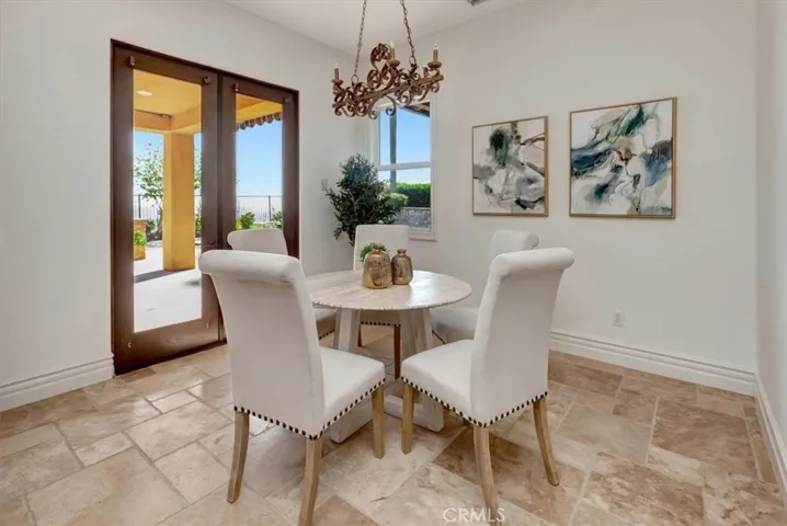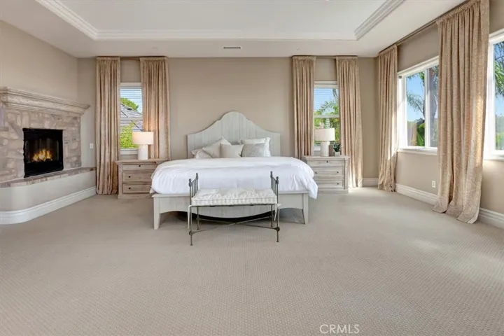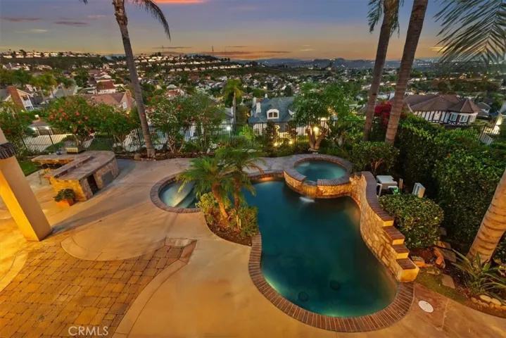Tuscan Elegance with Panoramic City Views in Guard-Gated Hillcrest. Discover timeless sophistication in this stunning Tuscan-style estate built in 2005, offering 6,468 sq ft with 5 bedrooms, 5.5 baths, and a 4-car garage. The open-concept design connects the family room and gourmet kitchen featuring custom cabinetry, granite counters, prep sink, and professional-grade stainless appliances. A main-floor bedroom with en-suite bath provides ideal guest or multi-generational living. The primary suite includes a sitting area, double-sided fireplace, spa bath, and large deck with sweeping valley views. Enjoy resort-style outdoor living with a sparkling pool, spa, and built-in BBQ island surrounded by lush landscaping. Set on a cul-de-sac within the exclusive Hillcrest guard-gated community, this home defines refined Orange County.