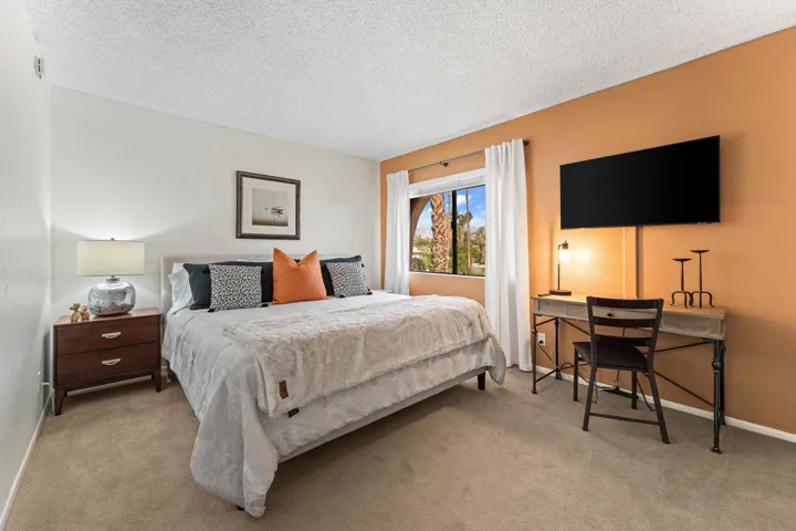 LONG OR SHORT TERM RENTAL | 30-Day Minimum Welcome to Casa de Oro, a beautifully landscaped community nestled in the highly sought-after Little Tuscany neighborhood of Palm Springs. This stylishly updated 2-bedroom, 1.5-bath townhome offers the ideal mix of comfort, convenience, and resort-style living–available for long or short-term stays with a 30-day minimum. Step inside to a bright and open main level featuring 24×12 porcelain tile flooring, a fully remodeled modern white kitchen with Quartz countertops, stainless steel appliances, a chic tile backsplash, and a full laundry room. A sleek 3/4 bath on the main level adds everyday convenience for guests. Upstairs, you’ll find two generously sized bedrooms with soft carpeting and mountain peek views of the San Jacinto range. The remodeled full bathroom includes a dual-use layout with an additional vanity area in the primary bedroom, perfect for added privacy and function. Relax or entertain on your private brick-tiled patio, which offers a tranquil outdoor escape and subtle mountain views. A detached one-car garage provides secure parking and additional storage. Residents of Casa de Oro enjoy access to a wide range of amenities including two pools, two spas, a clubhouse/rec room, two tennis courts, and a pickleball court. The location is unbeatable–just minutes from Uptown and Downtown Palm Springs, where you’ll find top-rated dining, shopping, entertainment, and nightlife. Furnishings are optional, and large dogs are welcome, making this home a flexible, pet-friendly rental in a prime location. Three Month $2895, Six Month $2795, Nine Month $2695, Twelve Month $2595