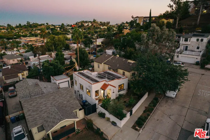 Perched on a quiet hillside street, 3306 Minto Court is a charm-filled Spanish retreat in the heart of El Sereno. From the moment you pass through the walled hacienda-style front garden, find yourself in a light-filled 2 bed/1 bath casita where classic architectural character meets the kind of thoughtful modern upgrades that make life easy. The living room exudes warmth and style: gleaming hardwood floors and wood-paneled walls lead to a built-in dinette area perfect for enjoying meals while gazing at views of the mountains beyond. Enjoy cooking in a fully renovated kitchen with stainless steel appliances, quartz countertops, and plenty of storage. Downstairs, past the dedicated laundry room, find a 132 sqft basement with built-in shelving offering a multitude of possibilities–a wine cellar for your favorite finds, or simply a dream space for organization and storage. Outside, find a fully renovated detached 180 sqft office space accented by elegant tile and French doors that open out onto lush greenery–an inspiring place to work, create, or host guests. The outdoor spaces are where the home truly shine. The current owners have transformed the yard into an entertainer’s paradise: two separate fire pit lounges (chic outdoor furniture included!), string lights draping past mature avocado, pomegranate, and orange trees, and lush drought-tolerant plantings evoke resort-style living at its finest. Enjoy dining al fresco with friends and end your evenings curled up on the sofa with a drink and a blanket beside the fire. Practical upgrades make life here as effortless as it is beautiful: the home boasts fully paid-off solar panels that eliminate your electric bill, new roof on main house and office (2024), new electrical panel (2024), central HVAC, EV charging station, whole-house water filtration system, alarm system, double-paned windows updated with new flashing, and more. Located less than a mile from Rose Hill Park and the edge of Debs Park nature reserve, you’re also centrally located to DTLA and all the hot shopping and dining in NELA (as well as El Sereno hot spots like Evil Cooks and lil’East Coffee). Don’t miss your chance for the best of LA living at an unbelievable price–with its timeless architecture, modern conveniences and breathtaking indoor/outdoor balance, 3306 Minto Court will remind you why you fell in love with California in the first place.