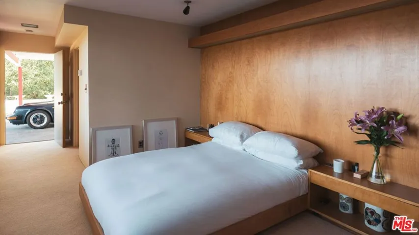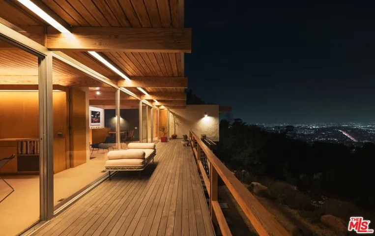 A flawless restoration of Richard Neutra, FAIA :: The Linn Residence, 1961. Sits on a secluded promontory perched, above the legendary Mulholland Drive in the Hollywood Hills, with explosive views of the Valley and the San Gabriel Mountain range. Neutra lifts the main level above the site and over the carport and a separate guest quarters to further enhance the views. This second level consists of a living area divided by a hearth, newly restored kitchen, ensuite primary with bath, guest bath, two bedrooms separated by a collapsible wall, and the red room sauna. The grounds include terraces, decks, private pool, and gated drive. Absolutely everything impeccably restored.