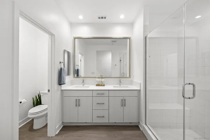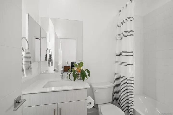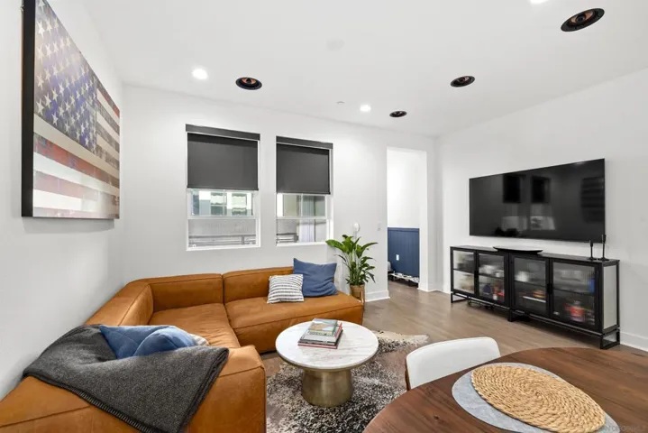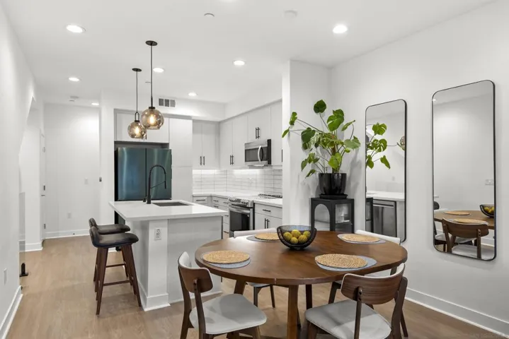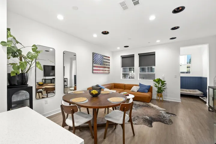 Welcome to 7621 University Ave, Unit 102 a modern, move-in-ready townhouse offering the perfect blend of style, functionality, and location. With 3 full bedrooms and 3 full bathrooms, this thoughtfully designed home showcases sleek upgrades and contemporary living just minutes from vibrant downtown La Mesa. Step inside to discover a bright, open-concept layout featuring luxury vinyl plank (LVP) flooring throughout, sleek modern glass railings that visually open up the space, and built-in ceiling surround-sound speakers for an elevated entertainment experience. The spacious living and dining areas flow effortlessly into a modern kitchen with stainless steel appliances and plenty of prep space ideal for gatherings or quiet nights in. Smart details continue throughout, including a custom-built nook that makes the perfect dog living space or coffee/dry bar, adding both charm and versatility. Upstairs, the primary and second bedrooms each feature private bathrooms, offering comfort and privacy for every household member. The primary suite includes a small walk-in closet and a large shower with a built-in bench and bottle enclave, designed for everyday luxury. The third bedroom and full bathroom are conveniently located on the main level, ideal for guests or a home office. Enjoy your own private, turfed patio with planter boxes perfect for creating a cozy outdoor retreat or growing a small home garden. The two-car garage offers secure parking and extra storage, while the low-maintenance community allows you to fully enjoy the best of La Mesa living without the upkeep. OWNED SOLAR