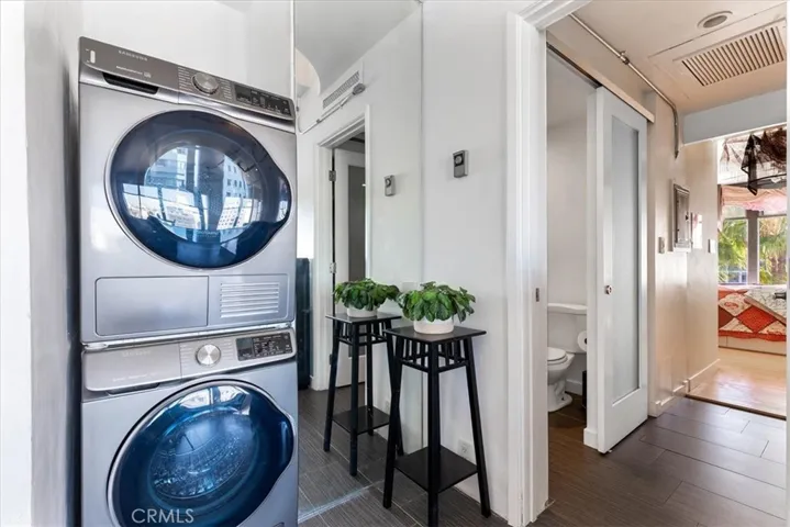 Step inside to find an open-concept floor plan featuring a modern kitchen with sleek cabinetry, granite countertops, glass backsplash, stainless steel appliances, and ample storage. RARE IN UNIT LAUNDRY! The spacious living and dining areas create the perfect space for entertaining or relaxing while enjoying the skyline views. Both bedrooms are generously sized, with the primary suite offering plenty of room for a retreat. The bathroom has been updated with a modern vanity, Full slab granite shower-tub combo, and vessel sink.