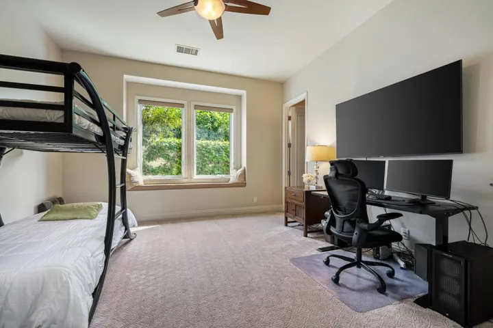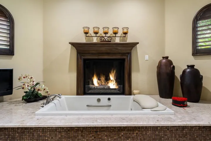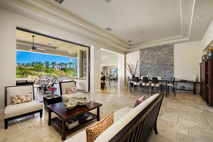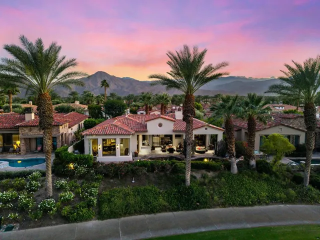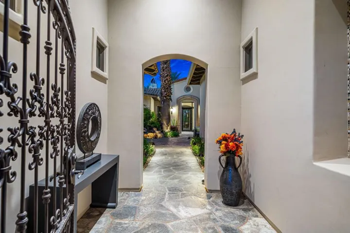 This immaculate Toscana Country Club home has it all!It is located on a private cul-des-sac street, offering a serene and private setting with unparalleled views of 3 golf holes on the Jack Nickolas South course, including mountain and lake views, offering stunning sunsets. With approximately 4300 sq. ft of living space, this elegant home consists of an open airy floorpan with the main living area offering 2 separate sitting areas adjoined by a wet bar with corner glass and wrap around seating, and an open formal dining area, is perfect for entertaining.The courtyard has been recently landscaped with flagstone and artificial grass, a private sitting area with fire pit and fountain. As you enter thru the custom iron front entry door, you will see beautiful stone floors, disappearing sliders which look out to the flagstone patio, zero depth entry pool with waterfall and hot tub, outdoor kitchen and with oversized barbecue area with seating. The mature landscaping provides privacy allowing for a beautiful desert oasis with gorgeous views beyond.The gourmet kitchen is a chefs dream, with a large island with breakfast par, double oven/cooktop, paneled refrigerator, beautiful cabinetry with tons of storage and walk in pantry. The adjacent dining room with stone wall is a wonderful touch for larger groups.The movie theatre room with soundproof walls and 8 leather movie chairs, is the place where all with gather to watch movies, sporting events and perfect for binging your favorite shows! Retire to the spacious private primary suite with a cozy reading area, fireplace, ensuite bath with an enormous soaking tub with fireplace, separate vanities, large walk in shower and 2 walk in closets.The separate 2 room casita offers your guests a private retreat with sitting area, desk and kitchenette with refrigerated drawers and built in cabinets. The bedroom has a spacious ensuite bath with double sinks and walk in shower. This gorgeous classic Toscana home has been meticulously maintained, beautifully decorated and is being offered furnished and it can be yours to enjoy this season!