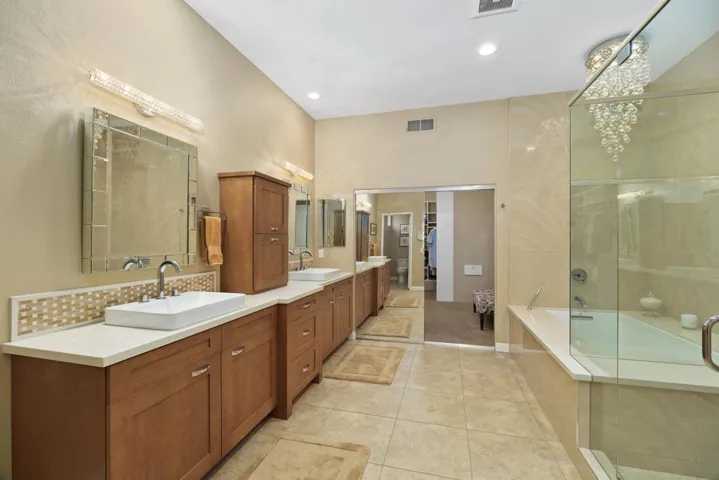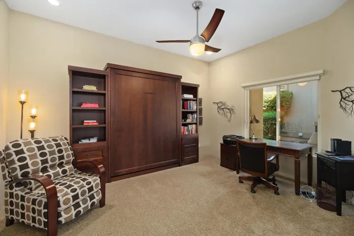 This beautiful remodeled single-story move-in ready 2600 sq ft home offers spacious living featuring 3 beds and 3 baths includes an attached Casita and has stunning views of the first fairway and mountains! The home has no attached walls, no stairs, and is the largest one-story floor plan in this community. As you enter the home through the custom glass front door you immediately notice the openness of this home with its tall ceilings and light and bright atmosphere. The custom Fireplace faces both the living room and formal dining room. The chef’s kitchen with granite countertops includes a custom center island offering casual seating, stainless steel appliances including a beverage center and a large custom design pantry. From the kitchen you can exit the sliding glass doors to the inviting private back yard patio with a large patio cover, professionally designed with desert landscape and your very own spa with a rock waterfall. The enormous Master Suite w/fairway views has a massive walk-in closet with built-ins, custom cabinets with loads of storage and dual sinks, and a large tub with a separate shower. The second bedroom is large and has a retractable Murphy bed with book cases which can also being used as an office/den. The third bedroom is also the attached Casita with it’s own private entry but you can also entry it directly from the home. This bedroom/casita has it’s own full bath and walk-in closet. The third full hall bathroom also suffices as a guest bathroom. This home also has it’s own separate laundry area with a sink and storage. Additional highlights include an attached 2-car garage plus a 3rd Garage for a golf cart, and a 10-hole golf course at a minimal annual cost! This community is ideally located in Rancho Mirage and is close to Eisenhower Medial Center, shopping, dining and entertainment, minutes to the The River, and of course the El Paseo Shopping and Dining District. This home has it all and can be either your perfect seasonal retreat or your full-time sanctuary. Don’t miss out this one!