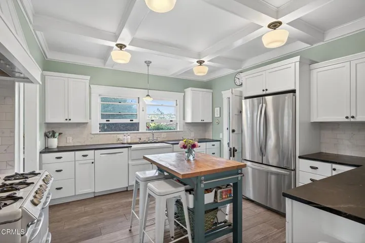Enjoy the warmth and character of this beautifully remodeled 5-bedroom, 2-bath Craftsman home, perfectly situated on a large corner lot in Oxnard’s historic district. Every detail has been thoughtfully restored to honor the home’s original 1912 charm, blending classic craftsmanship with modern comfort. Inside, you’ll find a bright and open living and dining area filled with natural light and warmth from the original hardwood floors. The remodeled classic kitchen, located in the heart of the home, perfectly captures the spirit of the era while offering modern functionality. Enjoy mornings in the sun-drenched sunroom, ideal for morning coffee, or relaxing in the evening with a good book. Two spacious downstairs bedrooms and a large, period-style bath offer convenience and comfort on the main level. Upstairs, you’ll find three more generous bedrooms and another beautifully remodeled bath, each space bathed in natural light and offering ample closet storage. The large enclosed front porch with a swing welcomes you home and invites you to slow down and savor the neighborhood’s charm. Outside, a beautifully landscaped yard surrounds the home, with a large backyard perfect for entertaining. A separate garage with alley access adds convenience, while a bonus backyard studio offers endless potential whether as a workshop, gardener’s space, or artist’s retreat. This home is a rare opportunity to own a piece of Oxnard’s history. It has been lovingly restored and is ready for you to create new lasting memories.