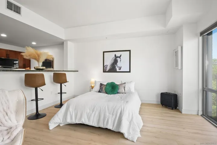 Welcome to Park Terrace, perfectly positioned in the vibrant Ballpark District of Downtown San Diego. This stylish studio maximizes every inch, offering floor-to-ceiling windows, a private balcony with bay views, and an inviting open layout. Recent enhancements include fresh paint, new window treatments, sleek hard-surface flooring, and stainless steel appliances, plus the convenience of in-unit laundry. Park Terrace residents enjoy generous outdoor lounges with BBQs, a well-appointed fitness center, and a spacious clubhouse. Across the street from Petco Park and moments from the Rady Shell, Seaport Village, Gaslamp Quarter, and the sparkling San Diego Bay—this is downtown living at its best. Welcome to Park Terrace, a premier residence located in the vibrant Ballpark District of Downtown San Diego. Petco Park is just across the street, and you are only minutes from Seaport Village, East Village, the Rady Shell, the Gaslamp Quarter, and the San Diego Bay. This thoughtfully designed studio condominium features an efficient layout that maximizes both space and functionality. The open floor plan is filled with natural light from floor-to-ceiling windows and includes a private balcony with bay views. Recent upgrades include fresh interior paint, new window treatments, sleek hard-surface flooring, and a modern kitchen with stainless steel appliances, microwave, oven, and dishwasher, plus the convenience of an in-unit washer and dryer. Residents of Park Terrace enjoy expansive outdoor common areas with BBQs, a fully equipped fitness center, and a spacious community clubhouse. Whether you are seeking a full-time urban residence or a sophisticated pied-à-terre in Downtown San Diego, this home combines modern comfort with premier access to the city’s most exciting attractions.