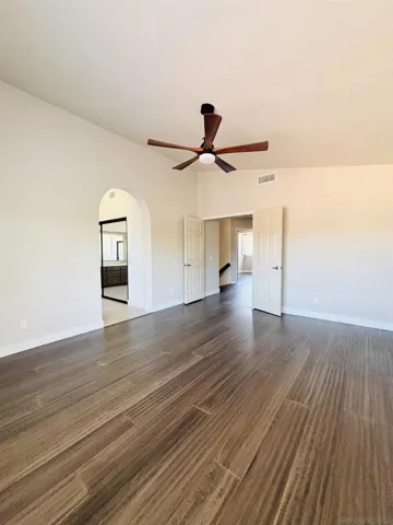 Situated in a peaceful cul-de-sac, this 2271 sq ft Spanish-Style home boasts 4 bedrooms and 3 full bathrooms. First floor bedroom and bath add a touch of convenience. Large extended driveway ensures amply parking & privacy. This home is not a flip, over the past 2 years sellers have thoughtfully updated it. Enhancements include removing the step-down in living room for a smoother flow, installing new kitchen, cabinets with quartz counter tops, stainless steel appliances, & adding sliding glass and French doors. Home features new bamboo wood flooring throughout, stairway redesigned using Spanish tiles. Spacious Primary bedroom upstairs offers stunning sunset views and an ensuite bathroom complete with a soaking tub, separate shower, dual sinks and large walk-in closet. Two additional bedrooms and a full bath complete the second floor. Expansive half-acre lot features beautiful desert landscaping, custom block walls, decorative pavers and a serene waterfall. Ideal for entertaining, backyard offers breathtaking sunset views and includes drought-resistant plants, citrus trees, sprinklers and solar lighting. The generous lot size also provides excellent potential for a future pool. In addition to the spacious three car garage, the backyard features a custom 23×11 workshop, which could possibly be converted into an ADU. Home also included a new Solar Panel System (fully PAID) with two batteries, providing substantial energy cost savings. Easy access to Freeways with close prox. to shopping, restaurants, schools, hospital. Home offers both convenience and elegance.