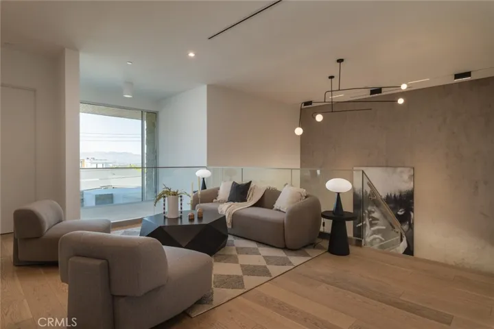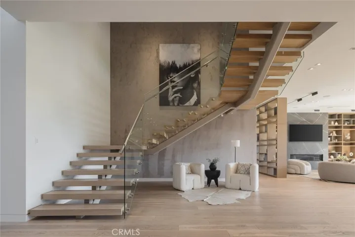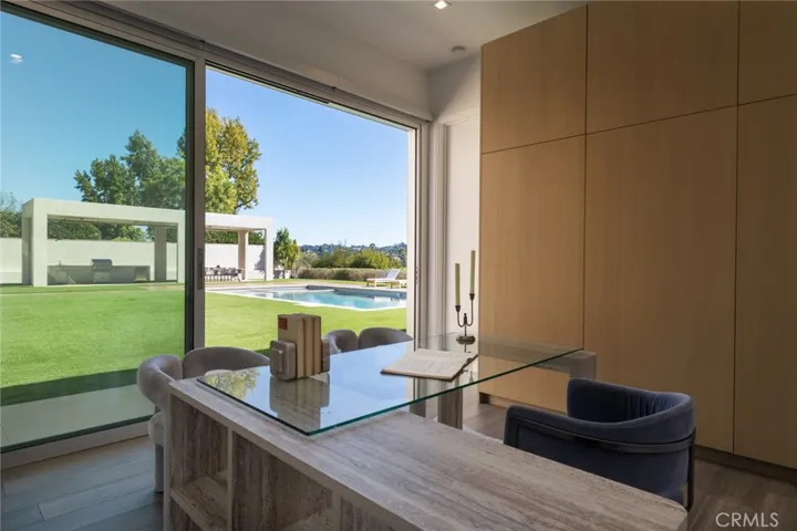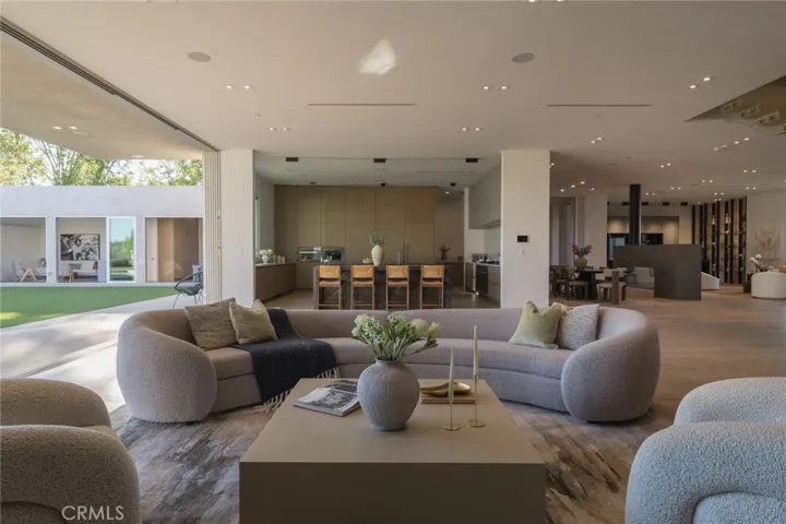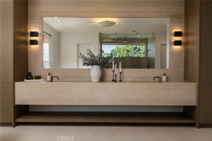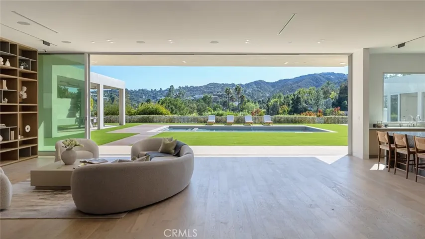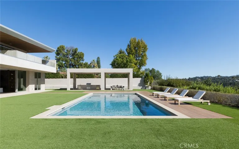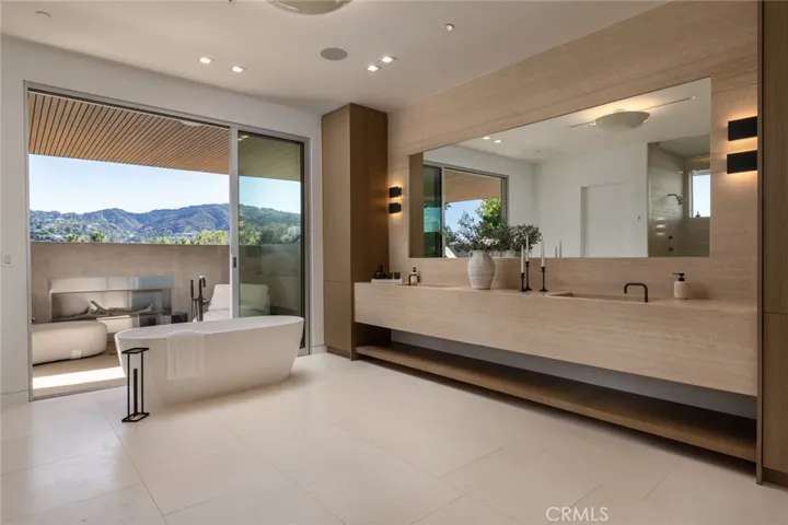 Perched in the coveted Encino Hills, this newly built architectural gem, designed by Dorothy Macik and architect Eran Gispan, blends modern design with organic serenity, framed by sweeping panoramic views. A grand pivoting glass door welcomes you into a world of refined luxury, where wide-plank white oak floors flow seamlessly, complemented by bespoke gray-smoke cabinetry. The gourmet kitchen is a masterpiece, featuring Quartzite countertops, honed marble finishes, Watermark fixtures, and custom cabinetry. Designed for effortless entertaining, the open-concept living spaces are anchored by a dramatic dual-sided fireplace, flanked by hand-forged steel shelving with smoke-tinted mirrors. Velvet wallpaper adds tactile luxury, while Fleetwood sliding doors dissolve indoor-outdoor boundaries. Ascend the floating staircase to four lavish en-suite bedrooms, each a private sanctuary. The primary suite offers a patio balcony with breathtaking views, a cozy fireplace, and a spa-inspired bath clad in travertine stone, complete with dual vanities, a soaking tub, and a glass-enclosed shower. A cinema-worthy movie theater ensures an immersive entertainment experience. The backyard epitomizes California living with a sparkling pool and spa, outdoor BBQ kitchen, and sports court, all set against the stunning unobstructed view of a hillside backdrop. A versatile ADU includes a gym and a bedroom—ideal for guests or extended stays. Additional highlights include a powder room with a handmade stone sink, modern drywall detailing, and Allied Maker light fixtures. Fully equipped with an automated smart home system and state-of-the-art sound, this estate offers unparalleled convenience and ambiance. Moments from Ventura Blvd, it’s a rare fusion of luxury, tranquility, and urban accessibility.