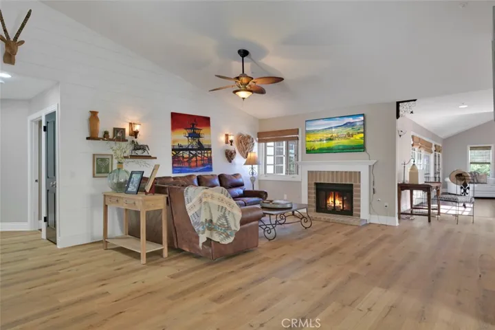 Come home to this fantastic San Clemente spread in the sought after neighborhood of Rimrock, located in in Forester Ranch. This home has been expanded to 2,134 sq ft! An enormous Bonus/Family room was added- (23 x 23) for entertaining with a beautiful fireplace, hardwood flooring and French doors looking out to the expansive covered patio comforting the serine back yard. The original Primary bedroom was turned into the huge master bath with a spacious shower and lovely double sink, extra cabinetry and another sink and cabinet for the perfect spacious morning coffee station and more. Primary bath also has dressing area with plenty of closet room now! A very private Primary bedroom was then added with hardwood flooring & even more French doors- two sets, leading to the covered patio, with ceiling fan and spiral staircase to the rooftop deck with freestanding fireplace and peek ocean view and great beautiful hills views! RV access is 14 x 23, not including the driveway area- plenty of parking for everyone! The large Bonus room and patio have been wired for surround sound for entertaining and beach vibe parties to come. The kitchen is light and bright with white cabinetry and light quartz countertops and beautiful stainless steel appliances, with a spacious dining area with French doors just off of it.