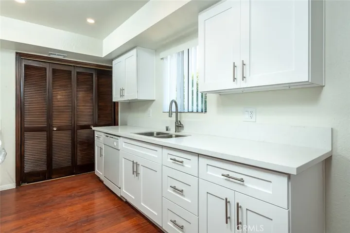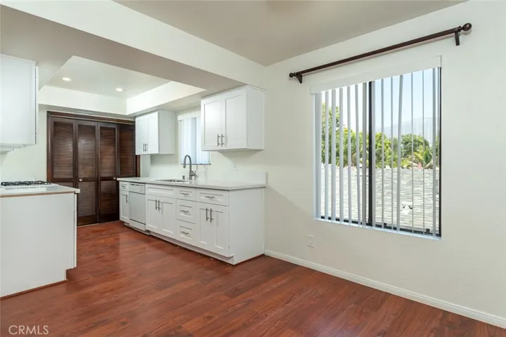 This beautifully maintained townhouse-style residence offers 2 bedrooms and 1¾ bathrooms, combining comfort and convenience in a quiet 5-unit complex. Step inside to discover an inviting light and bright open floor plan with laminate flooring throughout the living and dining areas, fixtures and vertical blinds. The spacious, remodeled kitchen features quartz countertops, a new double sink, new oven, dishwasher, and recessed lighting. The in-unit laundry area is conveniently located in the kitchen and includes a washer and dryer.