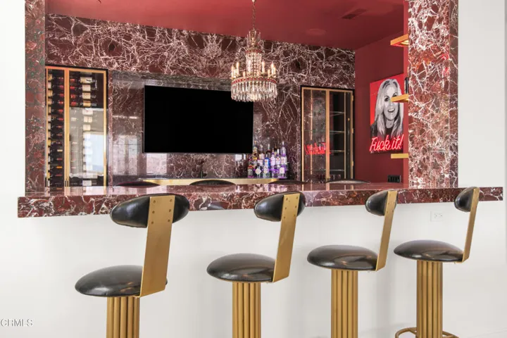 7216 Littler Court — A Living Work of Art in Country Club Estates, extraordinary custom residence. Encompassing over 5,300 square feet of masterfully curated living space w/five bedrooms & 6 bathrooms, this architectural masterpiece embodies the perfect fusion of sophistication, serenity, & resort-inspired luxury. Striking custom ribbed-glass entry door sets the tone–an artful balance of texture, light, & privacy that offers a captivating first impression. Inside, the home unfolds in a series of breathtaking moments: a sculptural glass staircase illuminated by cascading European crystal elements, brushed oak flooring, and rare Cristallo quartzite surfaces sourced from around the world. Every detail has been intentionally composed to create an atmosphere of elegance and warmth.The formal living room centers around a dramatic marble fireplace, while the primary suite redefines indulgence with a backlit onyx fireplace, hand-crafted stonework, and thoughtful touches such as a built-in coffee station and custom ice maker–an intimate sanctuary for morning reflection or evening retreat.At the heart of the home lies the remarkable Teranino Room, a glamorous homage to old Hollywood infused with the modern sensuality of a cosmopolitan lounge. This bespoke entertainment space features polished marble finishes, a glass-enclosed wine display, dual built-in refrigerators, and a custom bartender’s station designed for effortless service. Ambient lighting and rich textures set the scene for unforgettable evenings. Adjacent, the entertainment lounge invites connection and leisure, showcasing a one-of-a-kind custom pool table–the perfect setting for lively gatherings or quiet sophistication.Outside, the estate transforms into a private resort, where the art of outdoor living is elevated to perfection. The chef’s barbecue kitchen, heated cabana, and custom outdoor bar invite seamless entertaining, while the pool and spa glimmer beneath the night sky. A meditation garden, firepit lounge, and viewing terrace overlooking the mountains and golf course provide moments of peace and reflection. Set within a gated enclave bordered by a 27-hole championship golf course, this residence offers rare seclusion without compromise. Enjoy proximity to top-rated schools, fine dining, and convenient freeway access–all while immersed in a world of refined tranquility. It is a statement of artistry and intention–a singular expression of style, serenity, and substance.