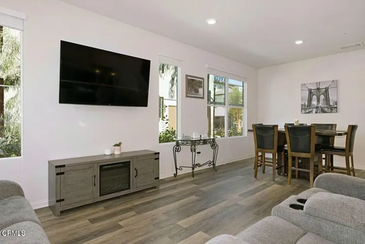 Gorgeous, bright and sunny end unit townhome in the development of Springville. Step through the front door into a lovely living and dining area full of windows to let all the light in, with luxury vinyl flooring, white wood blinds and powder room. The kitchen boasts stainless steel appliances, including refrigerator, quartz countertops, microwave, dishwasher and kitchen island with pendant lighting. Take a walk upstairs into the first of three bedrooms, including a spacious primary bedroom with large walk-in closet and luxurious primary bathroom with soaking tub, separate shower and double vanity with touch-less faucets. Outside the primary bedroom you’ll find a fully equipped laundry room with washer and dryer, two additional bedrooms and full bathroom. In the attached, two car garage you’ll find a tankless, energy efficient water heater and ample room for parking and storage, along with a driveway big enough to accommodate two cars. This unit is in an premier area with no neighbors on one side and faces outward to take advantage of an unobstructed view of the beautiful Spanish Hills. This property has a resort like community pool, hot tub and BBQ area with chaise lounges and showers.