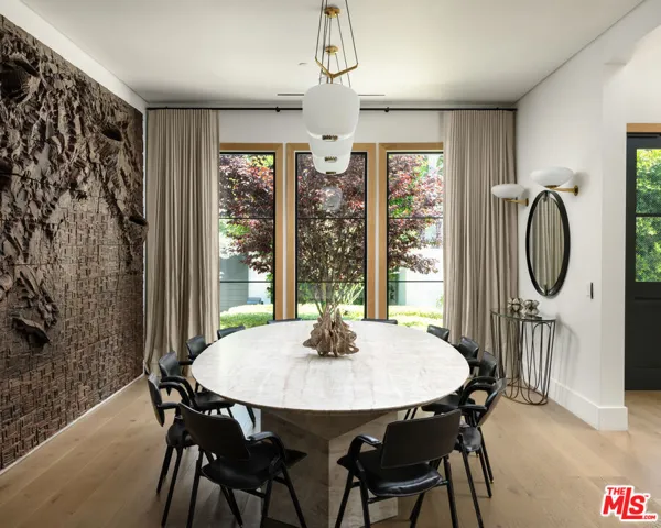 Tucked behind custom gates and mature hedging on one of the widest lots in the flats of North Bundy – with 120 feet of frontage – this modern Brentwood estate delivers an extraordinary blend of privacy, design, and innovation. The main residence offers 5 bedrooms and 7 bathrooms, plus a versatile office/den/nursery, while a fully equipped detached guest house with its own bedroom and bathroom brings the total to 6 beds and 8 baths. Purposefully designed for both entertaining and daily comfort, the home opens to a resort – style backyard with a large, private pool, mature landscaping, an outdoor kitchen, and a fire pit – your own secluded sanctuary. The expansive lot also offers space to add a sports court on the side of the home. A spacious 2-car garage is complemented by gated parking for up to four additional vehicles. Security is next-level, featuring an AI-powered camera system, automated perimeter alerts after hours, and 24/7 armed patrol service already in place – ensuring peace of mind without compromise. Inside, expansive open-plan living spaces connect effortlessly to the outdoors. The main kitchen stuns with dual islands, all Miele built-in appliances – including an espresso station, refrigerator, oven, microwave, and dual dishwashers – and a sleek frameless integrated stovetop. Discreetly tucked away, the chef’s kitchen is ideal for hosting or staff use, outfitted with an 8-burner Wolf range, additional Miele refrigerator and freezer, and a spacious walk-in pantry. A climate-controlled wine rack adds sophistication and function for wine collectors. For elevated living and entertaining, the home includes a state-of-the-art private theater with over $100K in hidden, professional-grade AV equipment and acoustically transparent finishes – creating a truly immersive cinematic experience. Upstairs, a sun-drenched hallway opens to a spacious deck for second-level indoor-outdoor living. The primary suite features its own private terrace with fireplace and a walk-in closet, complete with custom cabinets and island with key-card access drawers for valuables. Three additional guest bedrooms upstairs each offer en-suite baths and custom closets- ideal for balanced family living. Smart home integration elevates every detail, with wall-mounted displays and app-based controls for lighting, climate, sound, and security. A roof-mounted cell antenna boosts signal, and Wi-Fi boosters ensure strong, consistent coverage throughout the property. Custom furniture and collectible lighting fixtures – meticulously curated to complement the home’s design – are also available for purchase.