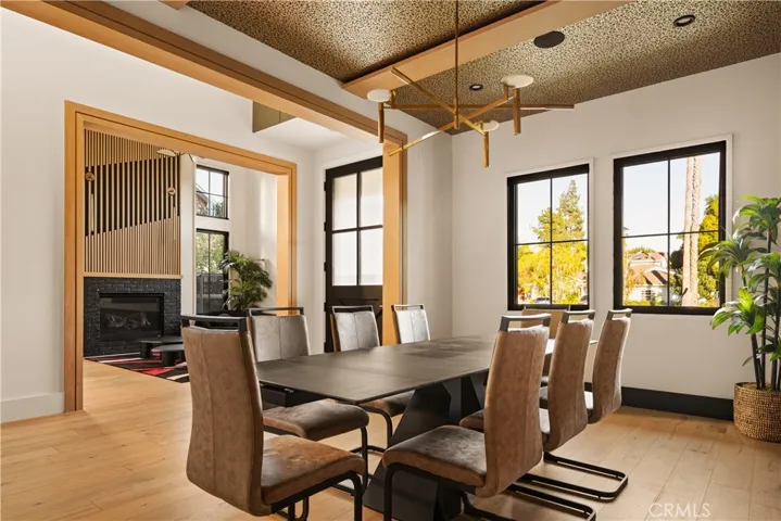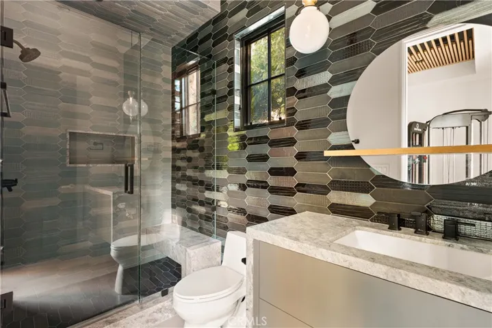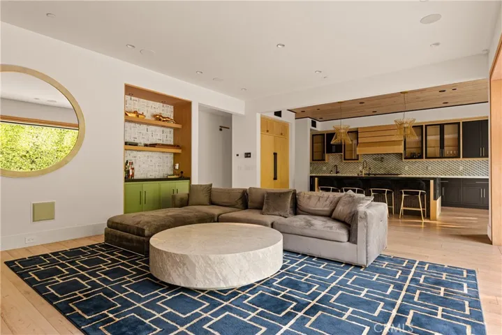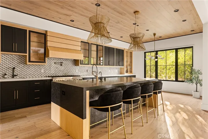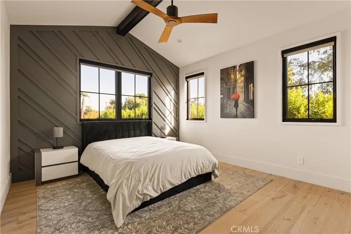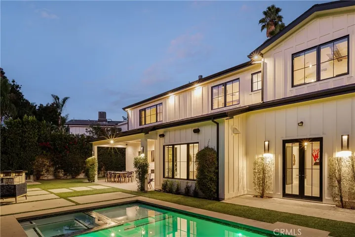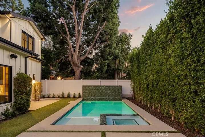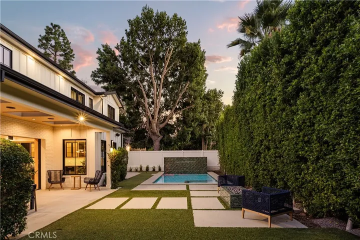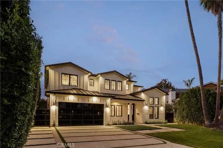 Tucked away on a peaceful cul-de-sac, this stunning Contemporary Farmhouse offers 5 bedrooms, 5.5 bathrooms, and over 4,500 square feet of luxurious living space, showcasing timeless design and exceptional craftsmanship throughout. The grand entry opens to a bright, open layout featuring a formal dining room adorned with custom wood detailing and a bar/butler’s area with a walk-in pantry. Across the hall, the formal living room impresses with vaulted ceilings, abundant natural light, and a striking fireplace framed in white oak paneling that extends to the ceiling. Beyond the elegant staircase, the open-concept family room and chef’s kitchen blend seamlessly with the backyard through expansive pocket doors, creating the perfect indoor-outdoor flow for year-round entertaining. The family room features built-in cabinetry, white oak accents, a stone fireplace, and a 75-inch TV for relaxed living. The adjoining gourmet kitchen is a showpiece with Thermador appliances, custom cabinetry, intricate tile work, a breakfast nook, and a large eat-in island. The lower level also includes a theater and an en-suite guest bedroom currently used as a gym. Upstairs, the primary suite serves as a serene retreat with vaulted ceilings, a marble fireplace, dual walk-in closets, and a spa-like bathroom featuring marble tile, dual vanities, a soaking tub, and an oversized rain shower with a built-in bench. Three additional en-suite bedrooms and a laundry room complete the upper level. The private backyard is an entertainer’s paradise, boasting lush landscaping, a pool and spa, BBQ area, fire pit, and grassy play space. Ideally located within the Hesby Oaks School District and minutes from the 101/405 freeways and vibrant Ventura Blvd, this home captures the essence of modern California living.