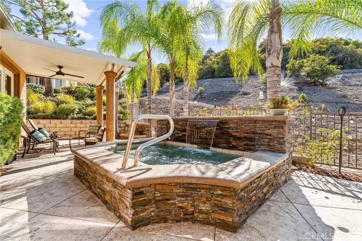 Welcome to 24217 Fawnskin, where hillside serenity meets turnkey luxury in this fully furnished Southern California gem. Backing up to open space with no rear neighbor and sweeping views, this private retreat is the perfect blend of modern comfort, designer finishes, and easy living. The charming craftsman-style exterior draws you in with its stone-accented columns, cozy covered porch, and inviting curb appeal—made even better by the HOA-maintained front yard landscaping (yes, one less thing on your to-do list). Step inside and you’re immediately greeted by a warm, open-concept layout designed to impress. Rich wood flooring flows throughout the space, anchored by a stunning stone fireplace and elevated with high ceilings, crown molding, and stylish light fixtures. The fully equipped kitchen is a chef’s dream with deep wood cabinetry, quartz countertops, stainless steel appliances, and a large island perfect for entertaining. Just off the dining area, massive windows and glass doors frame your unobstructed backyard views—and create seamless indoor-outdoor living. Out back, it gets even better. The private backyard oasis features a built-in spa with a cascading waterfall, a covered patio with ceiling fan, a mounted outdoor TV, and comfortable lounge space. All of it set against a tranquil hillside with no one looking in, just you and the sound of bubbling water under the palm trees. And here’s the best part—this home is being sold fully furnished. From the plush sectional to the chic dining setup, everything is already in place. Just bring your suitcase and settle right in. Whether you’re entertaining guests or unwinding solo, this home checks every box: privacy, views, style, and convenience. Located in a sought-after community that combines scenic surroundings with low-maintenance perks, 24217 Fawnskin is more than a home—it’s your personal sanctuary.