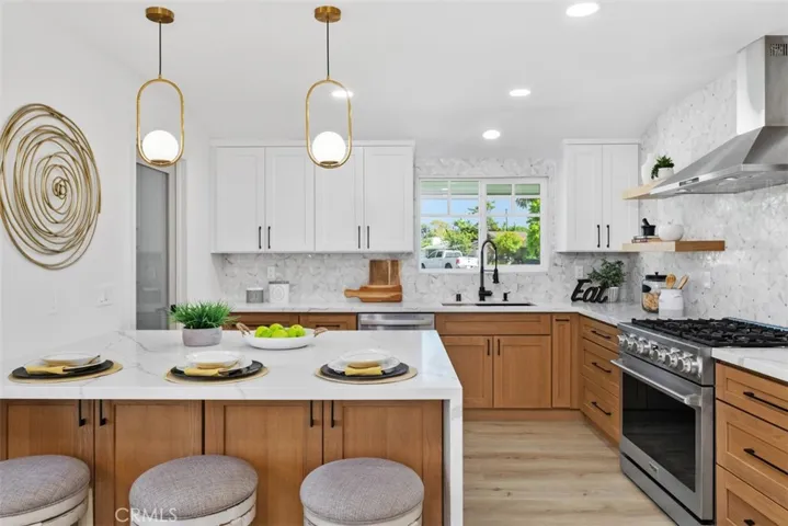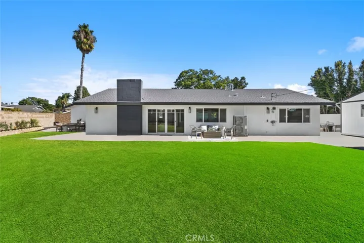 Welcome to 14261 Clarissa Lane, an exceptional single-story ranch-style residence in the coveted North Tustin community—expertly reimagined with timeless sophistication, modern comfort, and true California indoor-outdoor living. Nestled on an expansive ¼-Acre flat lot, this stunning home offers approximately 2,233 sq ft total, including a detached finished studio—perfect as a private home office, gym, creative retreat, or guest suite. Every inch of this property showcases high-end craftsmanship and thoughtful design. The main home features 4 bedrooms and 2.5 beautifully appointed baths, anchored by an open-concept layout that seamlessly connects the living, dining, and kitchen areas. The chef’s kitchen is a true showpiece, featuring new soft-close cabinetry, designer lighting, new stainless-steel appliances, and an oversized peninsula with quartz waterfall edge. In the family room, white oak built-ins with a mounted 65-inch TV, a built in bar with white oak floating shelves, shiplap accent wall, and custom wraparound fireplace mantel, create an elevated yet comfortable setting. The primary suite offers a serene retreat with dual closets and a spa-inspired bath featuring a walk-in shower with bench, double-sink oak vanity, pendant lights, and elegant finishes. Throughout the home you will find wide-plank flooring, new baseboards, recessed lighting, new doors, and other upgrades. Step outside to an expansive backyard designed for both relaxation and entertaining, with a large patio and lush grassy area—perfect for gatherings, play, or a future pool addition. The detached studio is fully finished and climate-controlled, offering incredible versatility for today’s lifestyle needs. Additional highlights include RV parking with sewer hook-up, new epoxy garage floor, newer AC system with smart thermostat, full PEX re-pipe, tankless water heater, new modern garage door, smart video doorbell, and EV Charger. Set on a quiet double cul-de-sac street and zoned for the highly sought-after Foothill High School. Low property taxes, no HOA, and no Mello-Roos. A rare opportunity to own a completely remodeled, move-in-ready home of this caliber. Buyer to verify all square footage, measurements, and information to their own satisfaction.