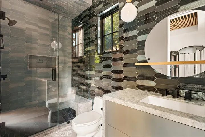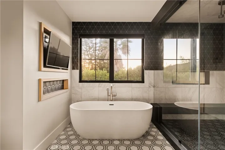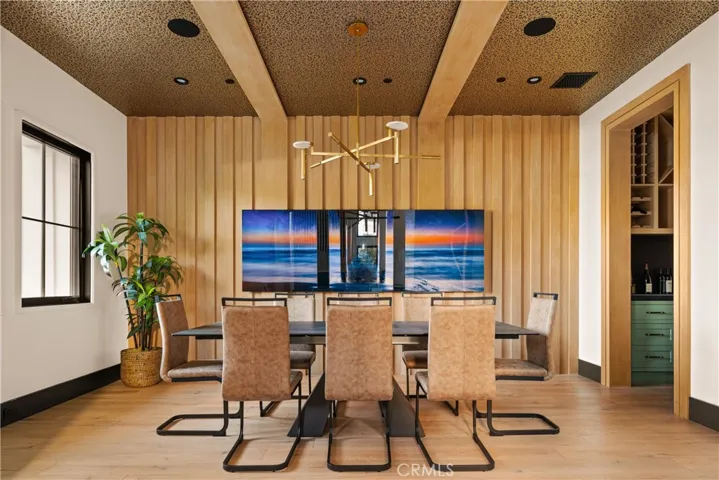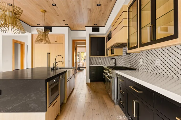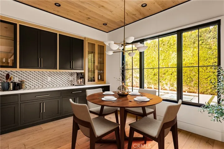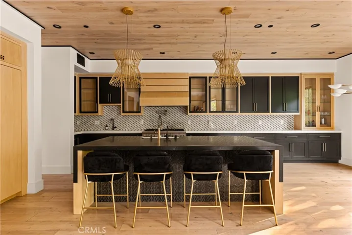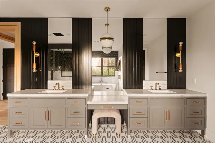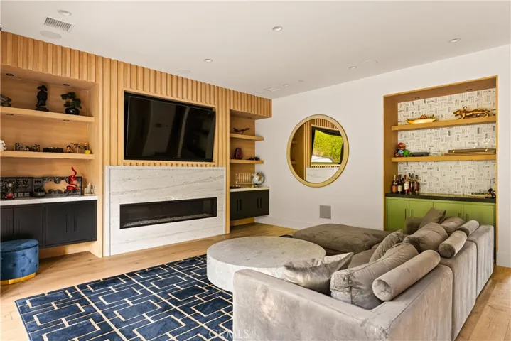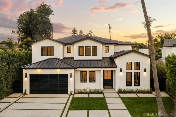 Tucked away on a peaceful cul-de-sac, this stunning Contemporary Farmhouse offers 5 bedrooms, 5.5 bathrooms, and over 4,500 square feet of luxurious living space, showcasing timeless design and exceptional craftsmanship throughout. The grand entry opens to a bright, open layout featuring a formal dining room adorned with custom wood detailing and a bar/butler’s area with a walk-in pantry. Across the hall, the formal living room impresses with vaulted ceilings, abundant natural light, and a striking fireplace framed in white oak paneling that extends to the ceiling. Beyond the elegant staircase, the open-concept family room and chef’s kitchen blend seamlessly with the backyard through expansive pocket doors, creating the perfect indoor-outdoor flow for year-round entertaining. The family room features built-in cabinetry, white oak accents, a stone fireplace, and a 75-inch TV for relaxed living. The adjoining gourmet kitchen is a showpiece with Thermador appliances, custom cabinetry, intricate tile work, a breakfast nook, and a large eat-in island. The lower level also includes a theater and an en-suite guest bedroom currently used as a gym. Upstairs, the primary suite serves as a serene retreat with vaulted ceilings, a marble fireplace, dual walk-in closets, and a spa-like bathroom featuring marble tile, dual vanities, a soaking tub, and an oversized rain shower with a built-in bench. Three additional en-suite bedrooms and a laundry room complete the upper level. The private backyard is an entertainer’s paradise, boasting lush landscaping, a pool and spa, BBQ area, fire pit, and grassy play space. Ideally located within the Hesby Oaks School District and minutes from the 101/405 freeways and vibrant Ventura Blvd, this home captures the essence of modern California living.
