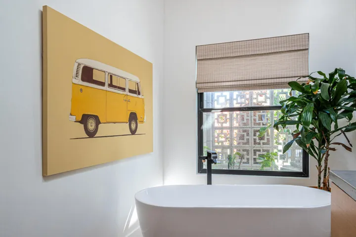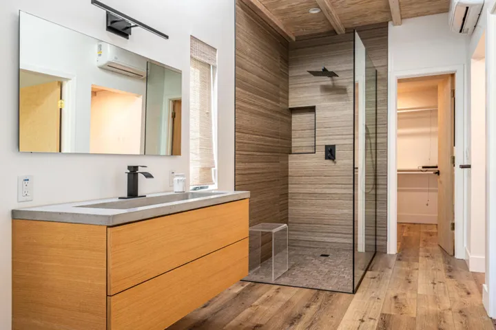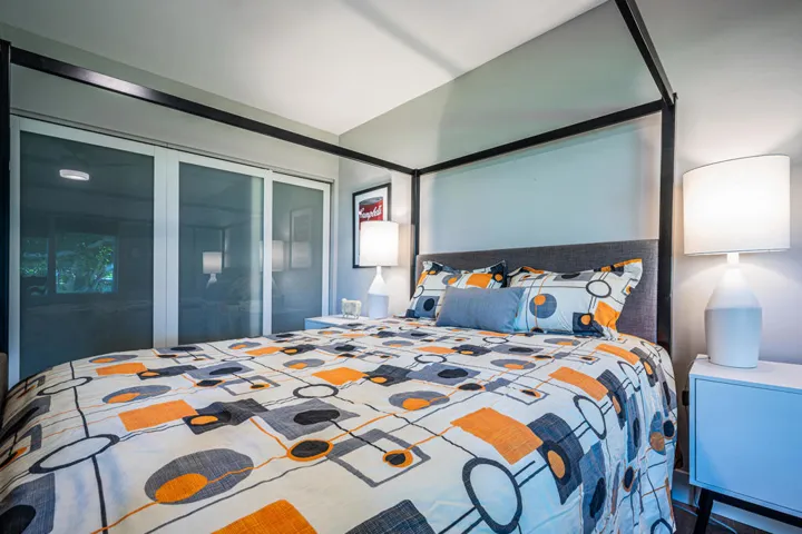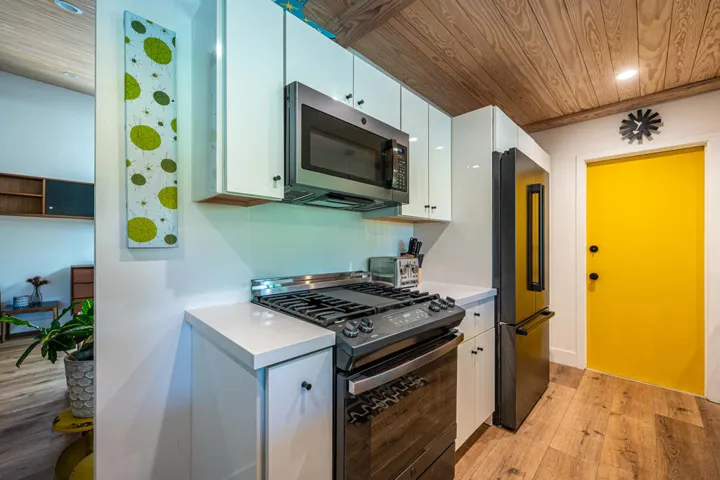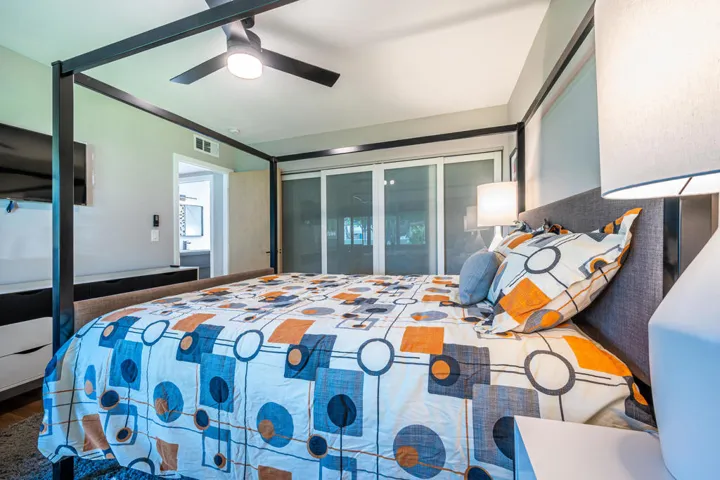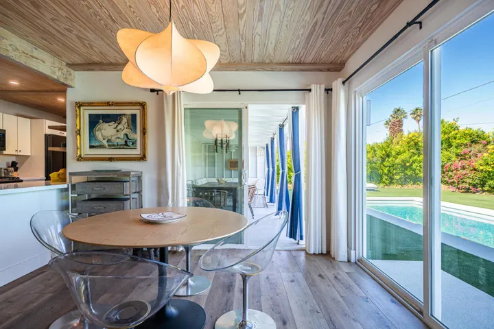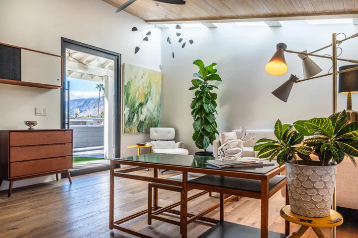 Modern designer home with mountain views! Fully renovated and reimagined contemporary home with panoramic mountain views in desirable Palm Springs. This modern residence features 3 bedrooms, 2.5 baths, and exceptional attention to detail throughout. The entry showcases a stunning full-glass door, leading to an expansive living room with vaulted wooden slat ceilings and skylights that fill the space with natural light. The gourmet kitchen includes black stainless-steel appliances, quartz countertops, open shelving, and a breakfast bar, flowing into a dining area and den–ideal for everyday living and entertaining. The primary ensuite offers a spa-like bath with a soaking tub, walk-in shower, and custom closet system. Guest bedroom also features extra-deep closets with built-ins, and the third bedroom could pull double duty as an office or guest space with a daybed, wardrobe, and desk. Enjoy resort-style outdoor living with mountain views, artificial turf, a saltwater lap pool, above-ground spa, and a covered cabana with outdoor lounge and dining areas. An attached two-car garage with mini-split AC provides flexible use for fitness or workspace. The property is fully fenced with an electronic sliding gate, shaded front yard, and mature plants and trees. Offered fully furnished. Available now for a 12-month lease.